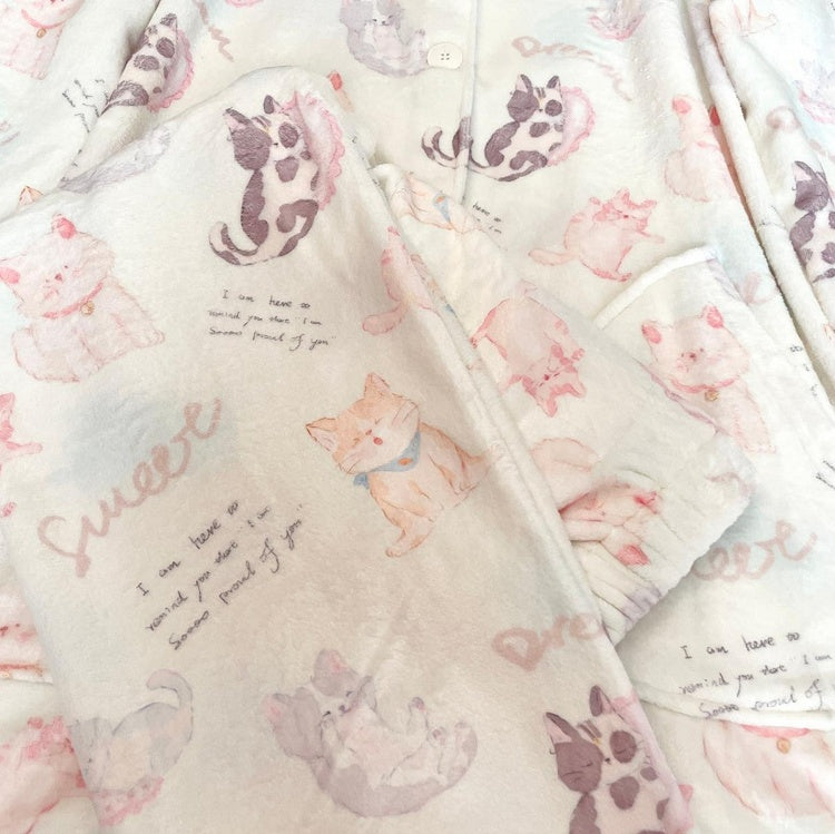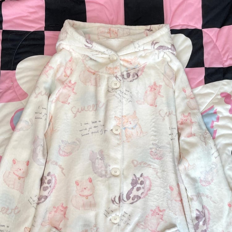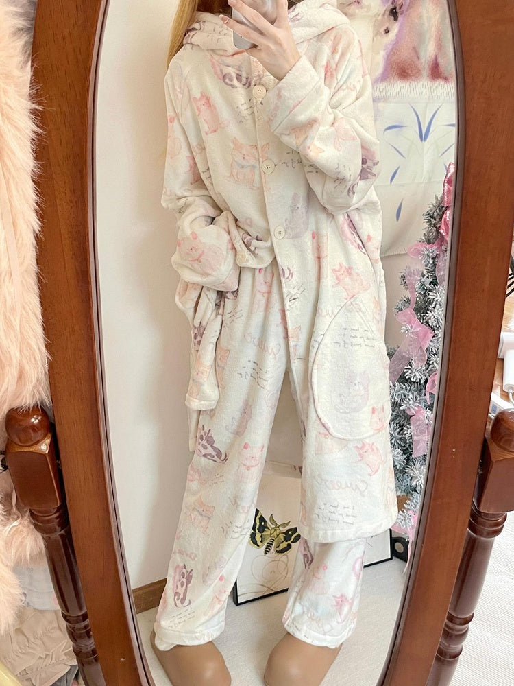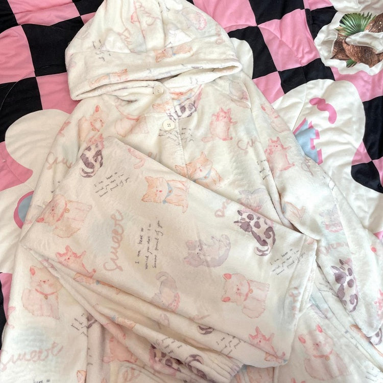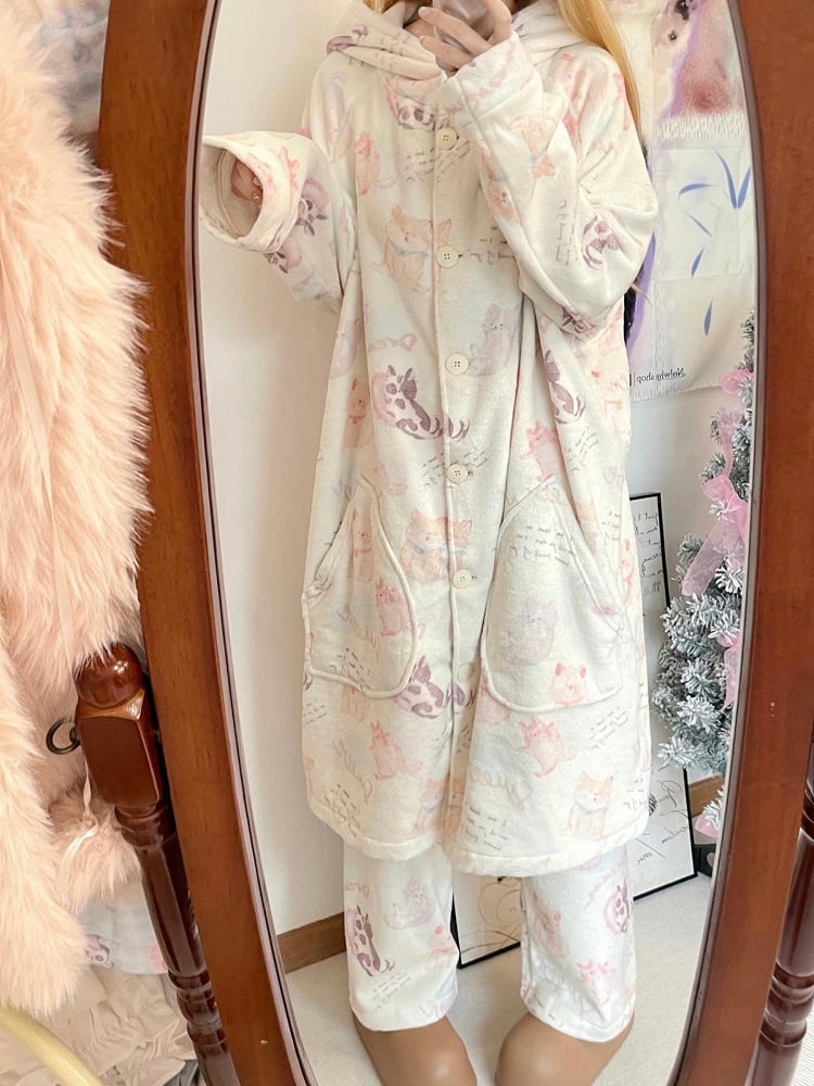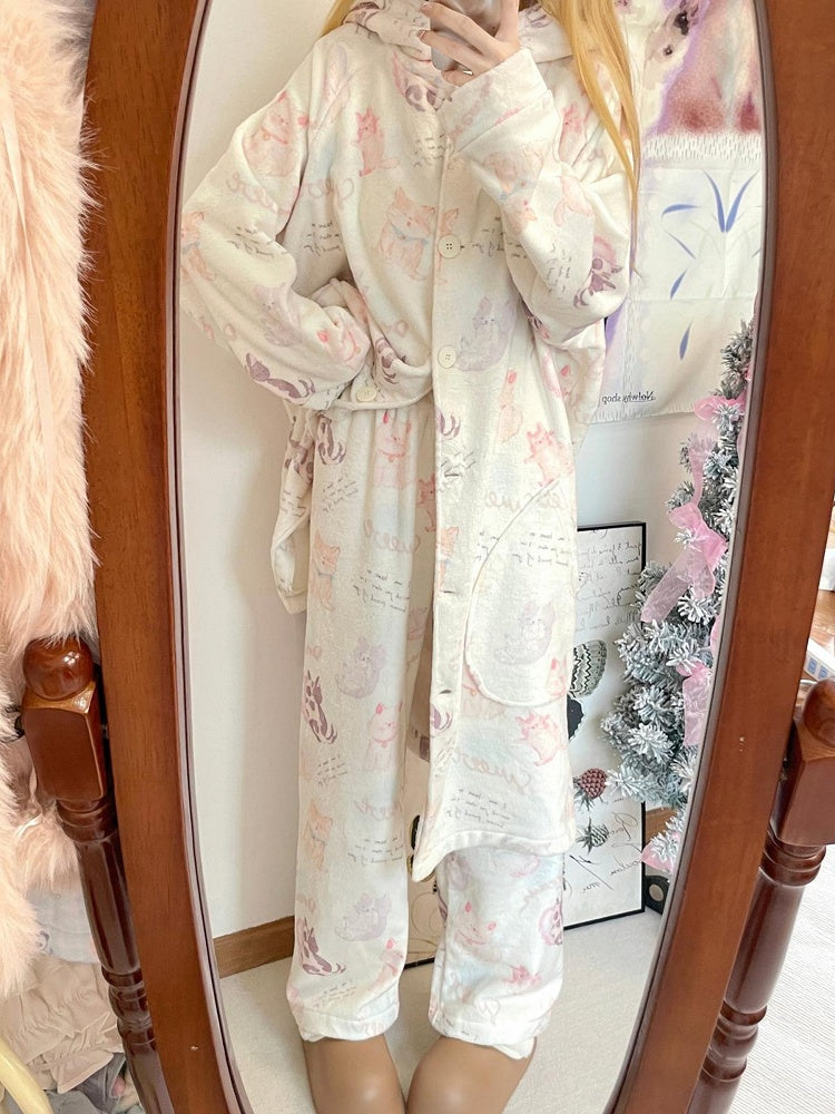 Embrace ultimate comfort and cuteness with our charming Kitty Pattern Hooded Robe and Pajama Set. The robe showcases an all-over adorable kitty print, complete with a cozy hooded design and convenient button closure for easy wear. Functional pockets add a practical touch to this delightful sleepwear piece. Paired with matching pajama pants featuring an elastic waistband, this set ensures a snug fit while keeping the playful kitty motif consistent. Perfect for lounging at home or a snug night's sleep, this set is a must-have for any kitty lover!