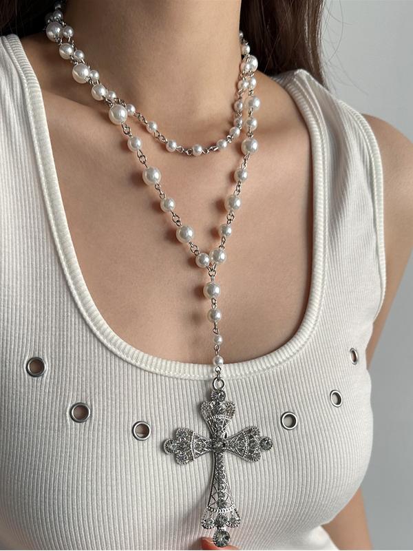 This exquisite necklace features a double-layered bead chain, elegantly connected to a cross pendant. The pendant boasts an intricate hollow design adorned with sparkling rhinestones, offering a perfect blend of sophistication and style.
