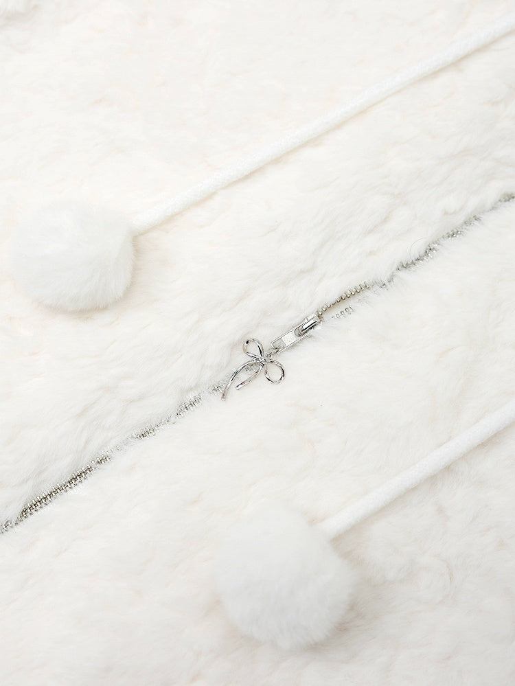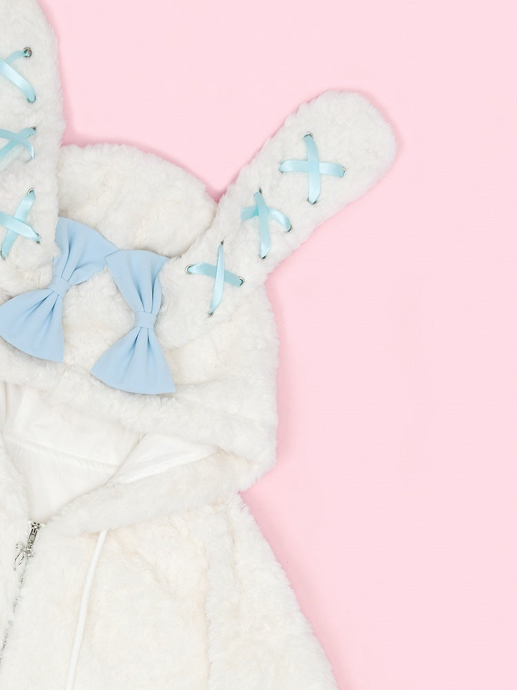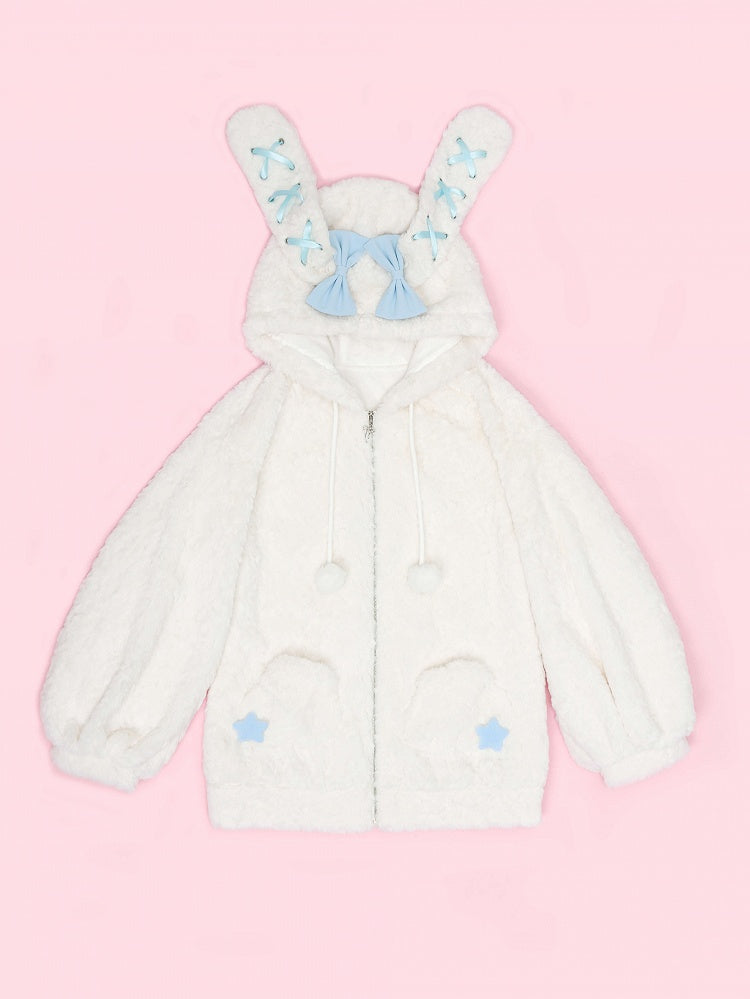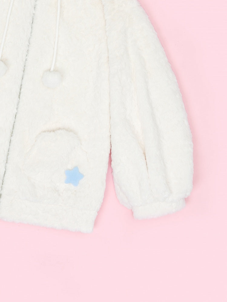 This adorable fluffy jacket, in a soft Cinnamoroll inspired color palette, features a creamy white fabric with light blue accents that evoke a sense of sweetness and comfort. The jacket is designed with cute puppy ear details on the hood, adorned with light blue bows and criss-cross ribbon accents. The loose-fitting sleeves and cozy material make it perfect for casual wear, while the light blue stars on the front pockets enhance its charming appeal.