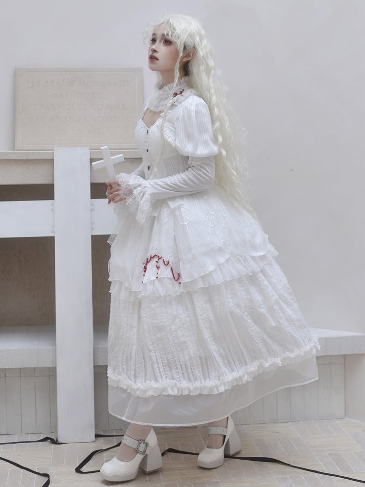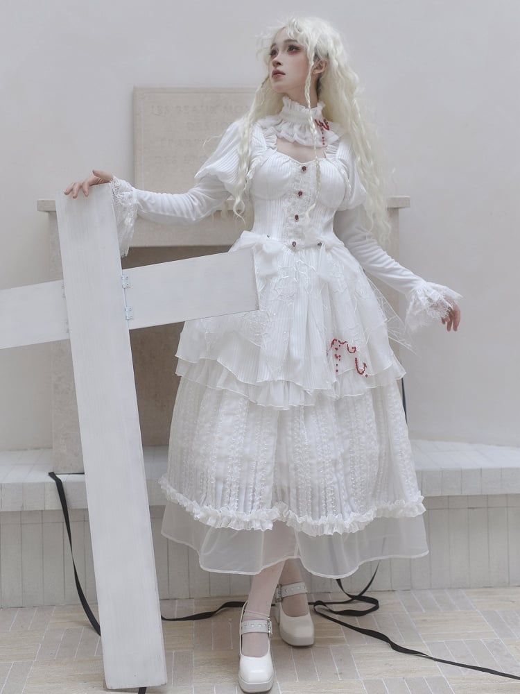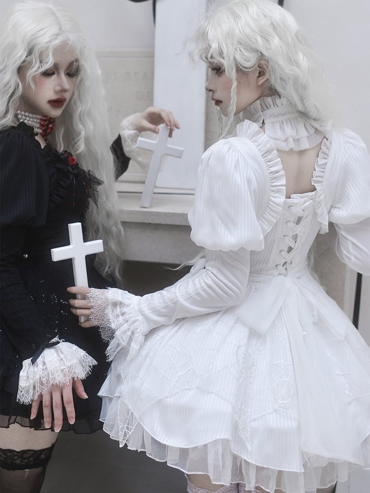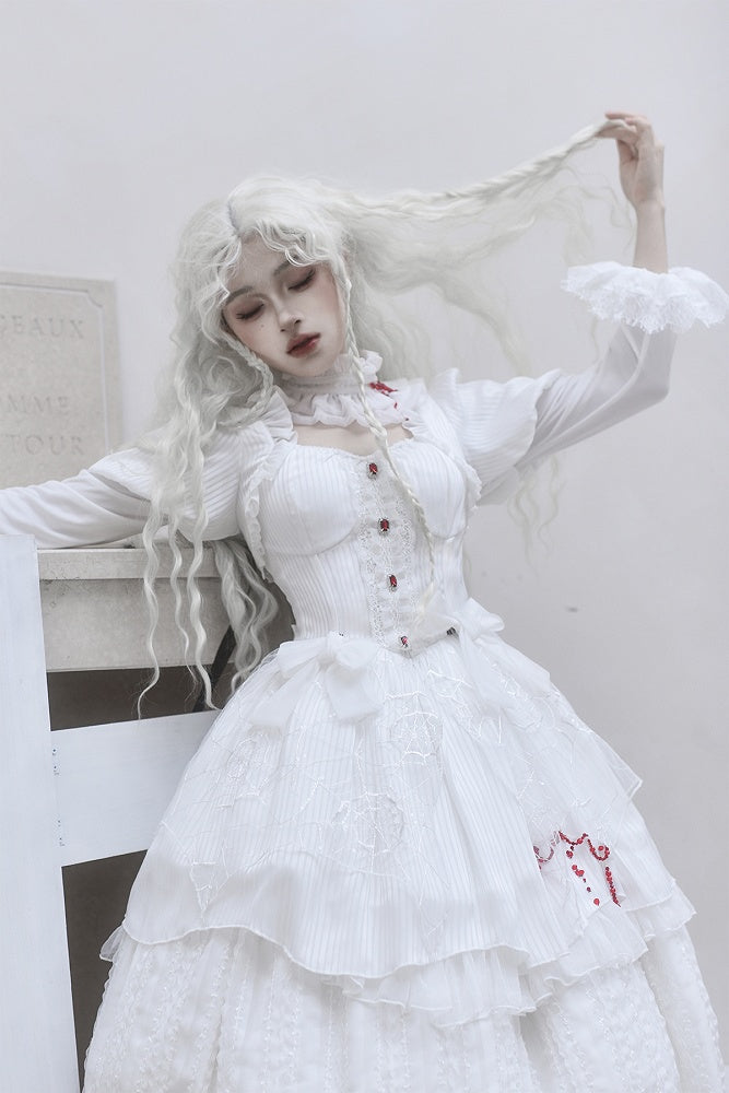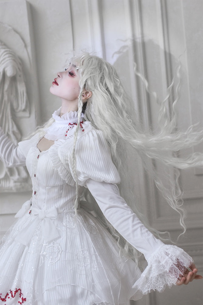 This exquisite piece features intricate spider web embroidery along the hem and adorned with striking red bead embellishment. Elegant lace cuffs enhance the sleeves, offering a delicate and feminine touch to the overall design. The dress includes a removable chest pad at the front for customizable comfort and style. The back is thoughtfully designed with elastic and a lace-up to ensure a perfect fit. Embrace your inner gothic Lolita with this beautifully crafted dress that seamlessly blends mystery and charm.
