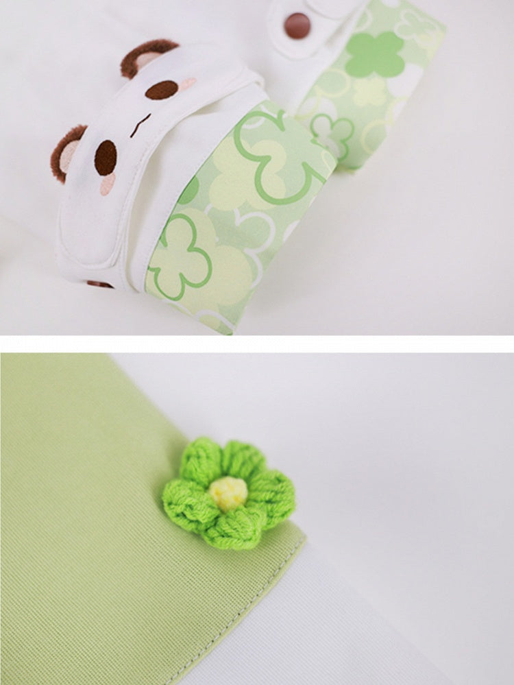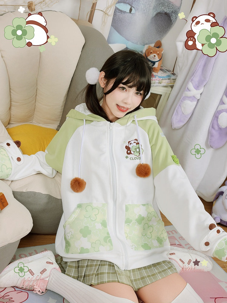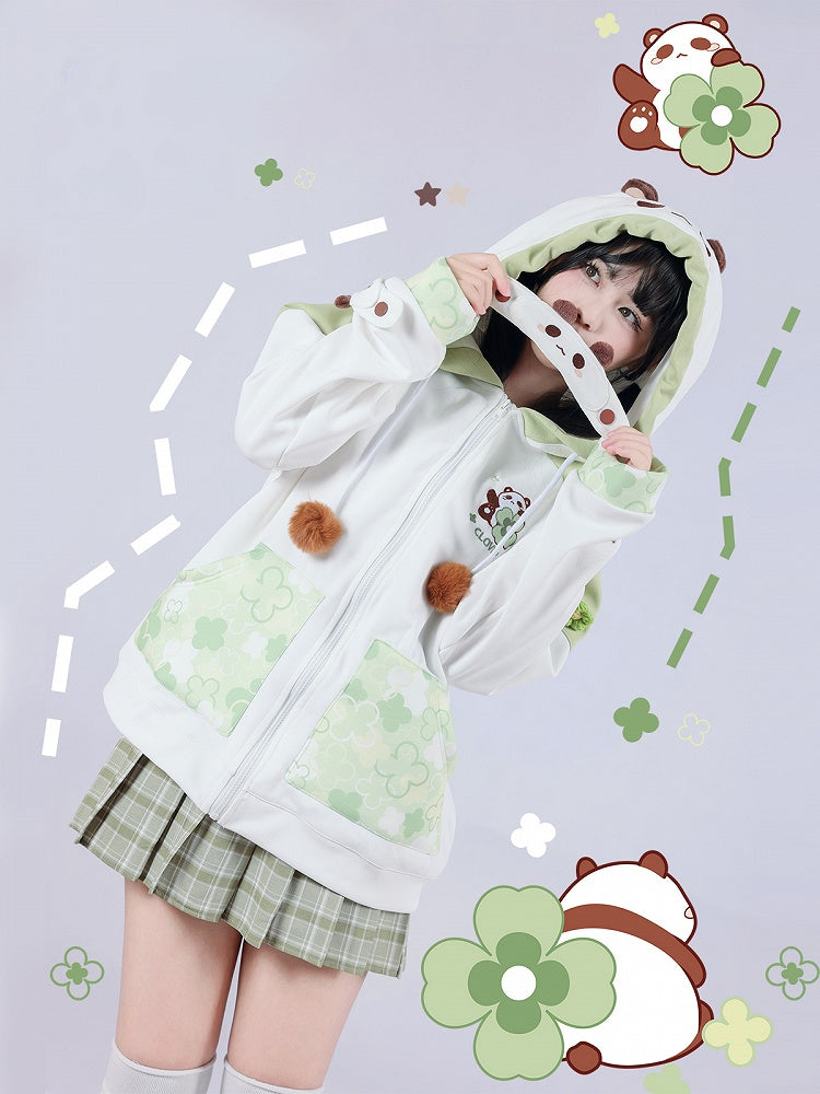 This hoodie features a zipper closure and a hood with an adorable panda design. It has panda and four-leaf clover embroidery patches on one side of the chest and on the back. The cuffs and pockets are decorated with four-leaf clover prints. Additionally, the cuffs come with detachable panda decorations.