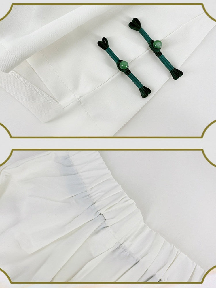 These shorts feature a high-waisted design with an elastic back waistband for a comfortable fit. The sides of the leg openings are adorned with traditional Chinese knot button embellishments, adding a touch of elegance. Additionally, the waistband comes with a detachable tassel charm for extra flair.