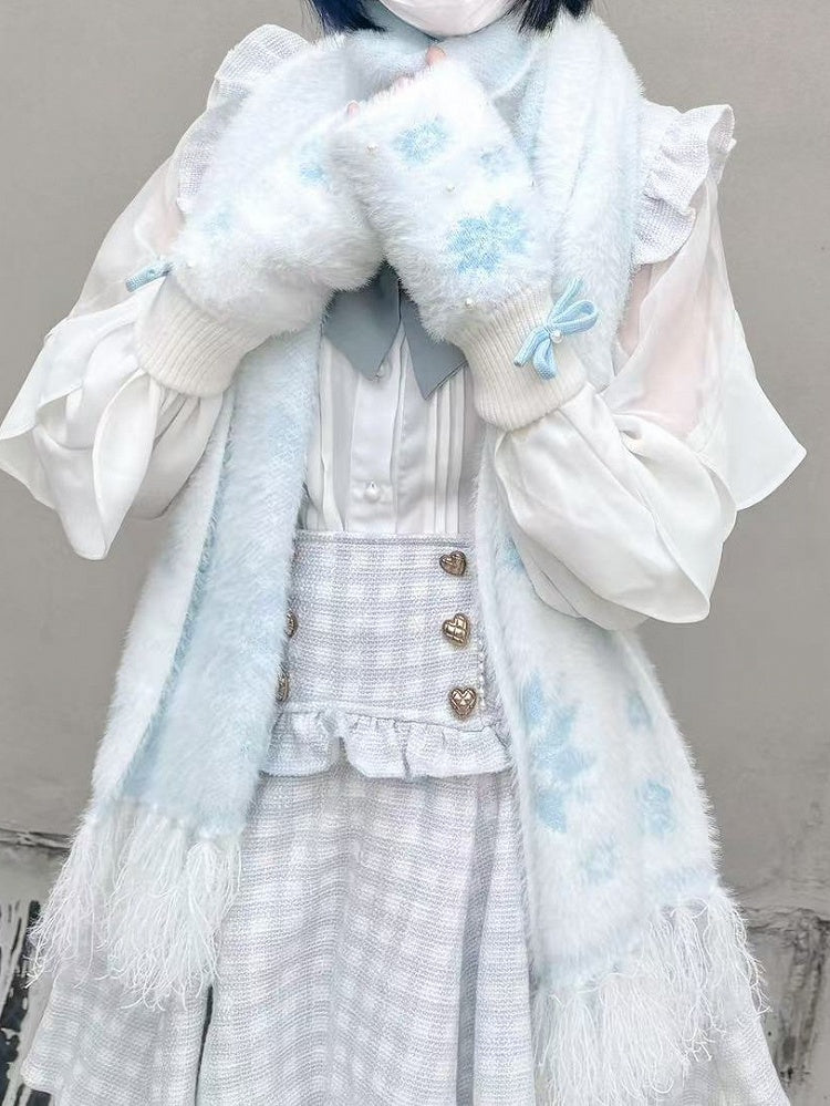Embrace the chill with these delightful fingerless gloves, perfect for adding a touch of whimsy to your winter wardrobe. Crafted from soft, cozy knit fabric, these gloves keep your hands warm while allowing full dexterity. The enchanting blue bowknot adds a pop of color, while intricate snowflake patterns and delicate bead details create a magical winter wonderland look.