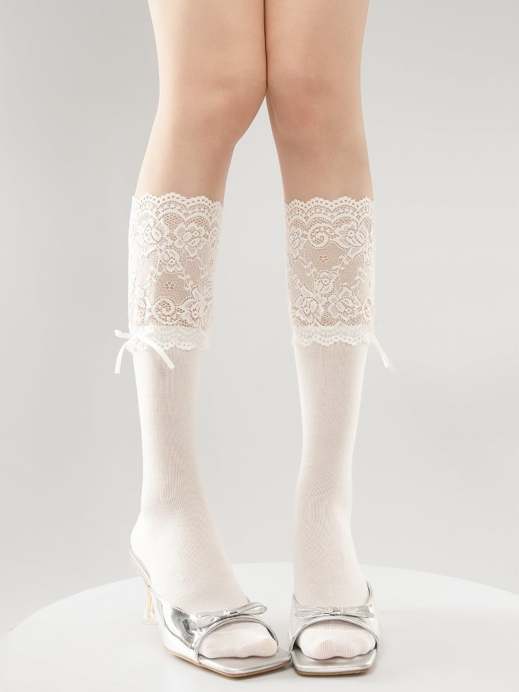White/Light Gray/Black Lace Cuff Calf Socks with Bow Decoration, sweet-cool and exquisite, comfortable and versatile, suitable for multi-scenes.