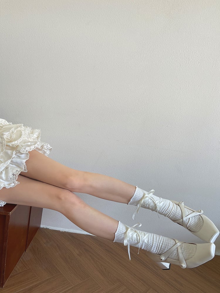 White/light grey ballet-style calf socks with Strap Design, exuding elegance, the strap detail adds delicacy, pairing well with ballet flats, Mary Janes and sweet-style outfits.