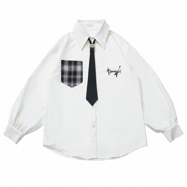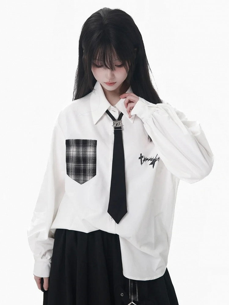 This white shirt has a plaid patch pocket on the chest and a printed design. The front uses a button placket. Wear it for casual or formal occasions.