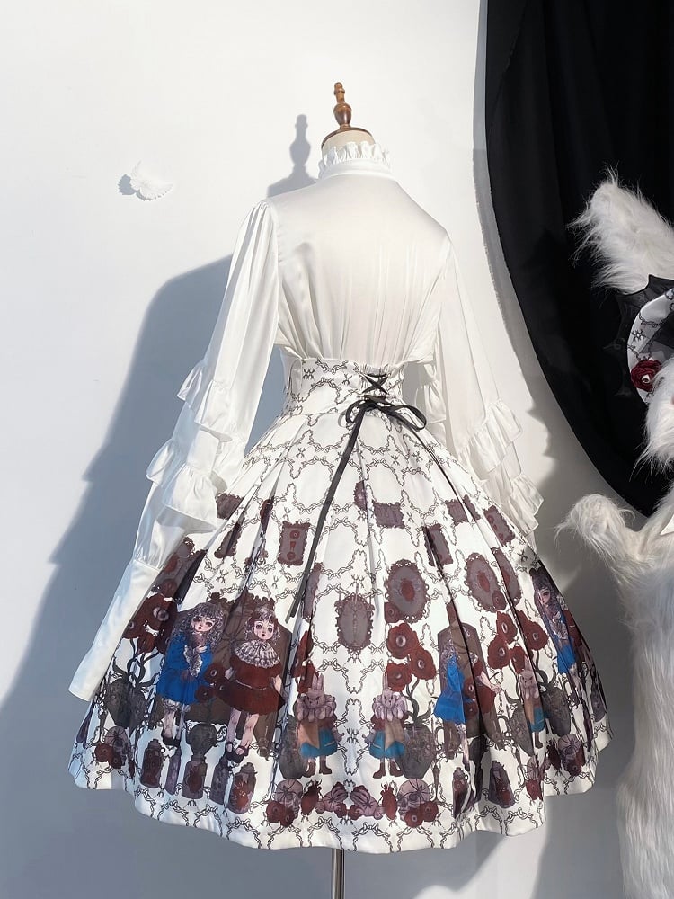 This gothic lolita skirt features a striking print of dark eyeballs and dolls, creating a unique and edgy look. The high waist and bat boning add a touch of drama and flair to the design. The adjustable back waistband ensures a comfortable fit, making it a stylish and versatile addition to any gothic or lolita wardrobe.