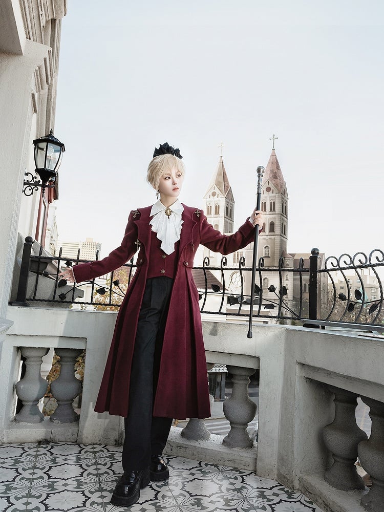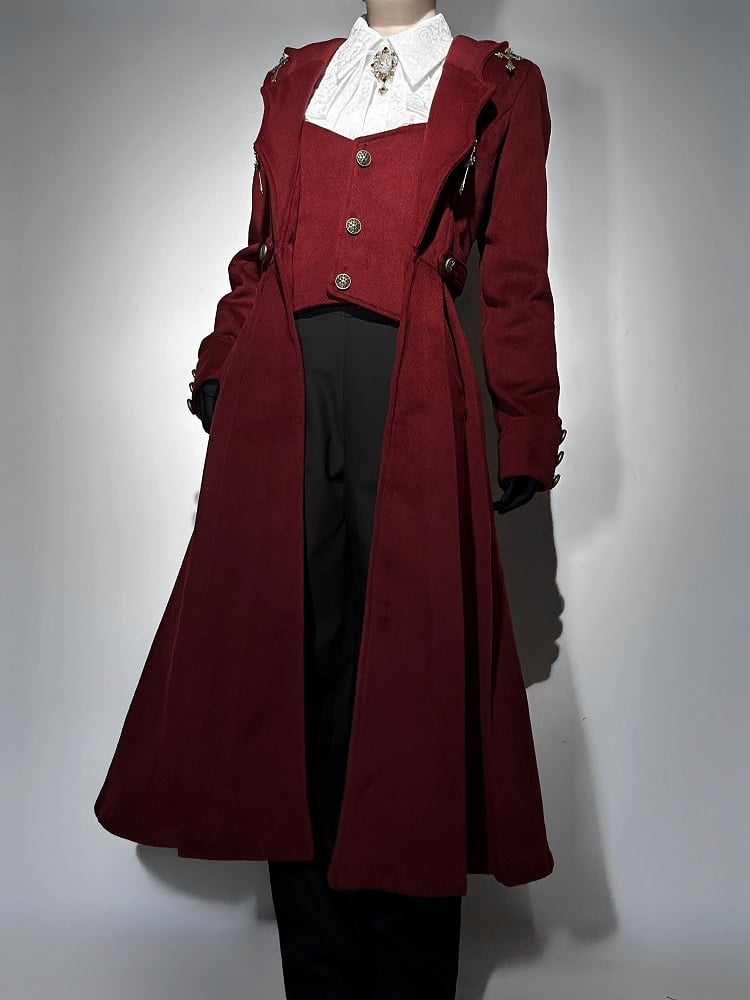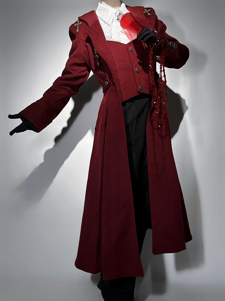 The red coat boasts a unique faux two-piece vest design, highlighted by four cross charms adorning the curved collar, the coat is further accentuated with antique bronze buttons, completing the look with an elegant gothic flair.