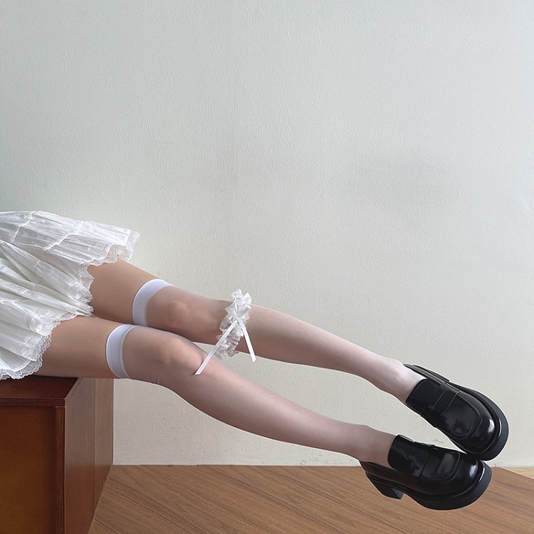 The price includes 1 pair of white over knee stockings + 1 white ruffled bow leg garter