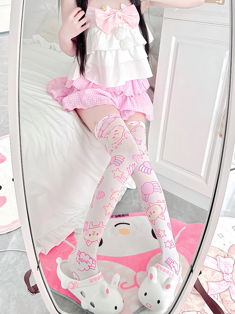 Step into a world of whimsy with these enchanting socks featuring adorable kitty and rainbow prints, along with additional charming embellishments. Perfect for adding a touch of kawaii flair to any outfit, these socks are a delightful blend of fun and fashion.
