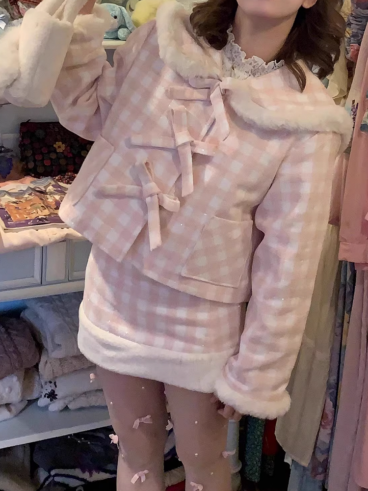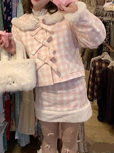 Elevate your wardrobe with this charming high-waisted skirt, featuring a delightful pink plaid pattern complemented by a luxurious white plush hem. Perfect for those who adore a blend of classic and kawaii style, this skirt offers a flattering silhouette that effortlessly enhances your look.