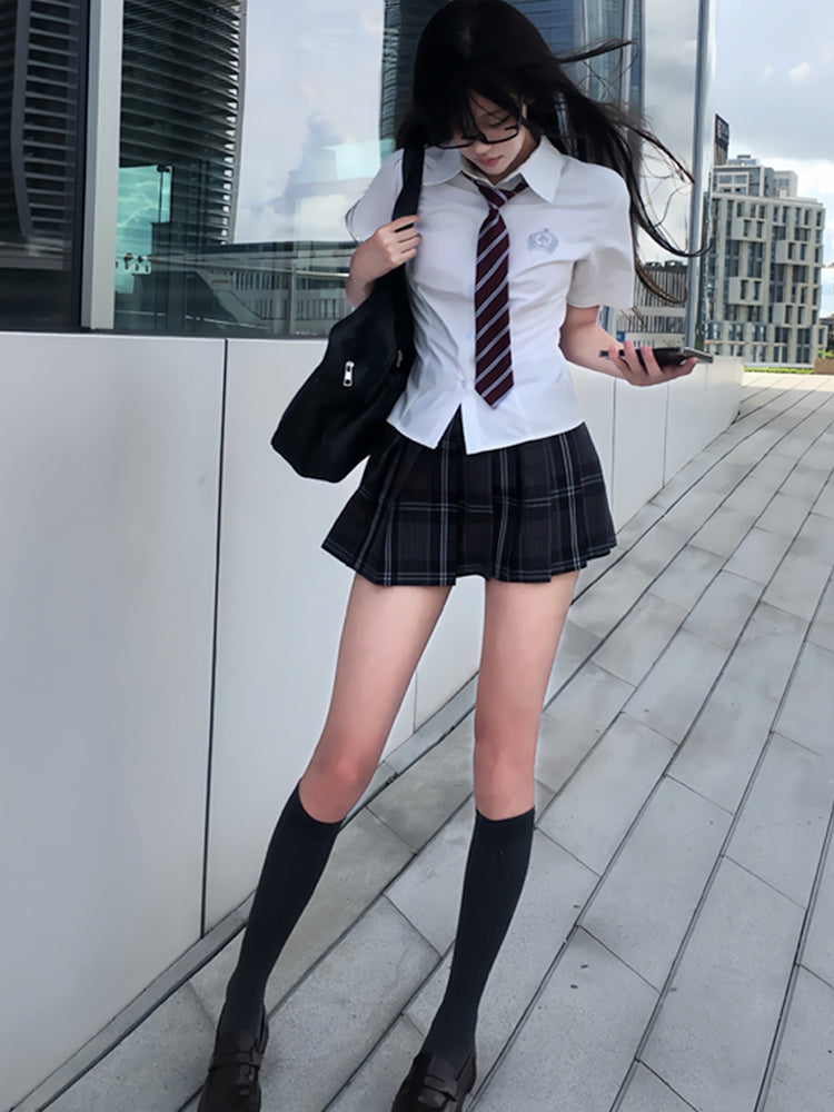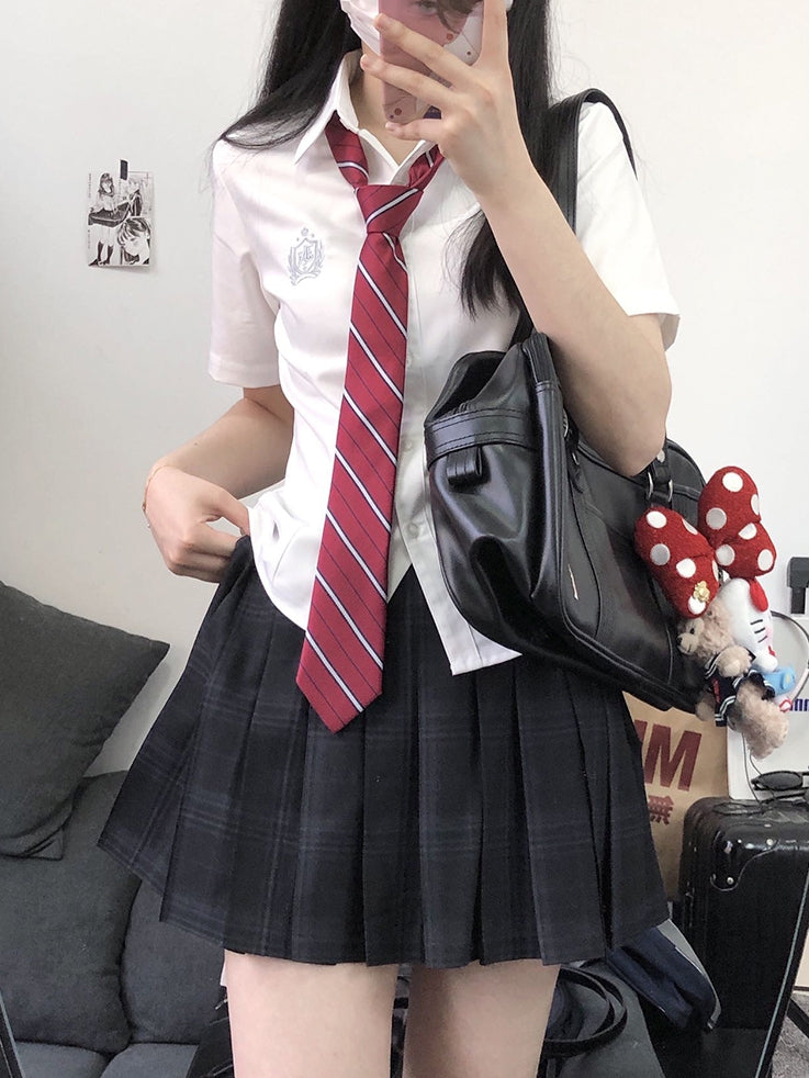 Elevate your wardrobe with this classic white preppy short sleeve shirt, featuring a flattering waist-cinching design that accentuates your silhouette. The shirt is adorned with a distinctive embroidered badge, adding a touch of sophistication and charm. Perfect for a smart-casual look, this versatile piece seamlessly blends timeless style with modern elegance. Ideal for school, casual outings, or any occasion where you want to showcase your chic, polished aesthetic.