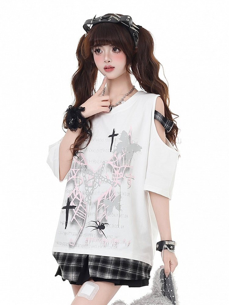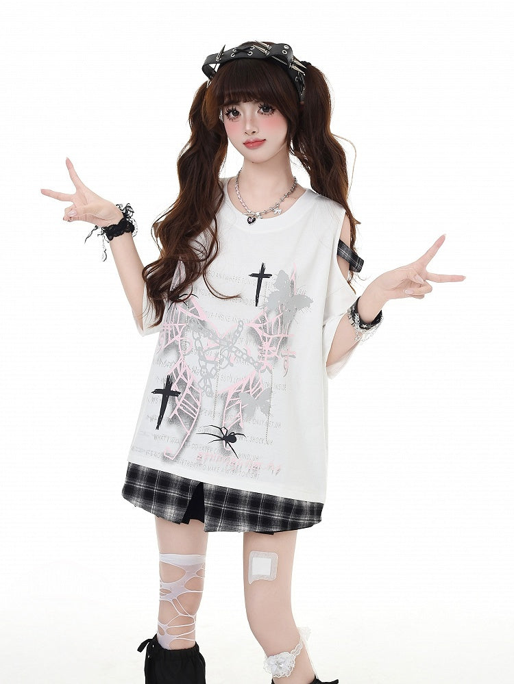 White Loose-Fit T-Shirt: Crafted from lightweight, slightly stretchy pure cotton, this mid-length tee features a classic crew neck and short sleeves. Unique design elements include center front slits with black and white plaid fabric inserts at the hem, and shoulder cut-outs with plaid straps. The front is adorned with gray text and graffiti-style prints of gray butterflies and pink hearts for an edgy, artistic touch.