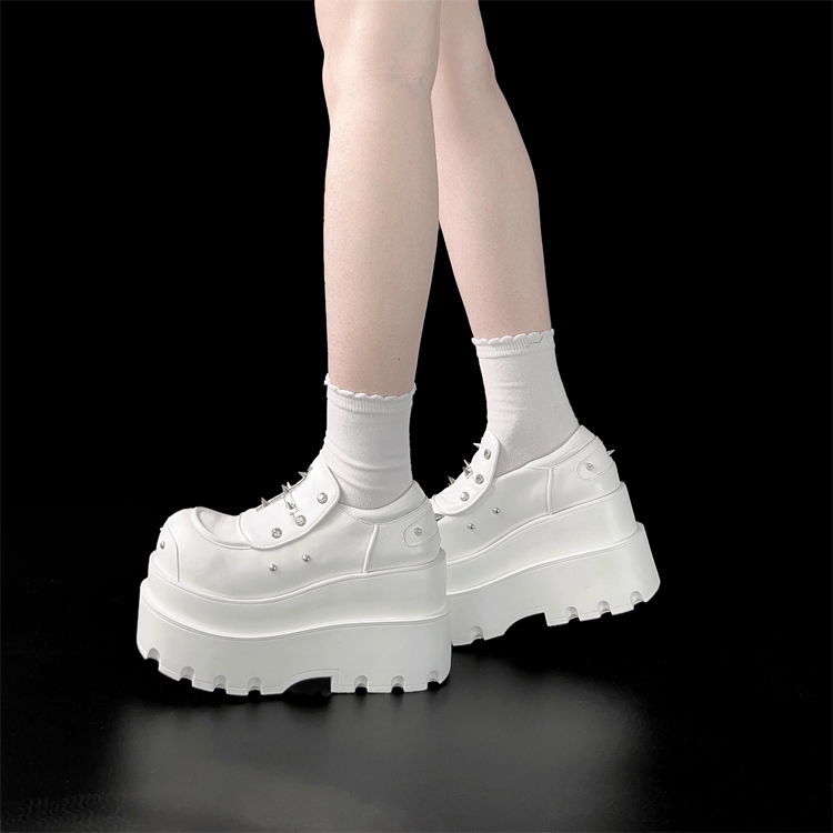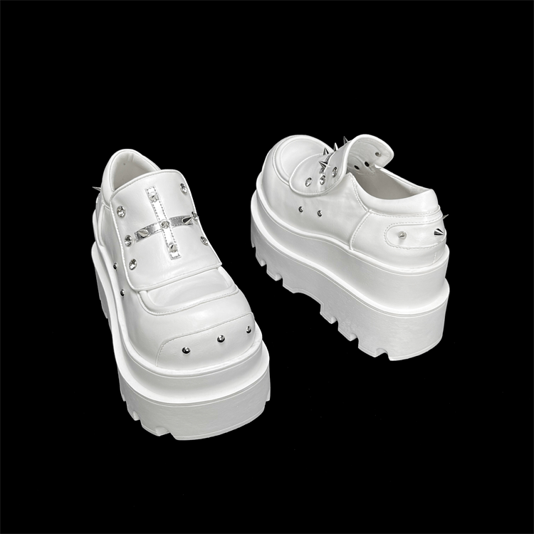 Step up your style game with these bold white punk platform shoes. Featuring intricate cross detailing and edgy stud accents, these shoes are designed for those who dare to stand out. The thick platform sole not only adds height but also ensures comfort and durability for all-day wear.