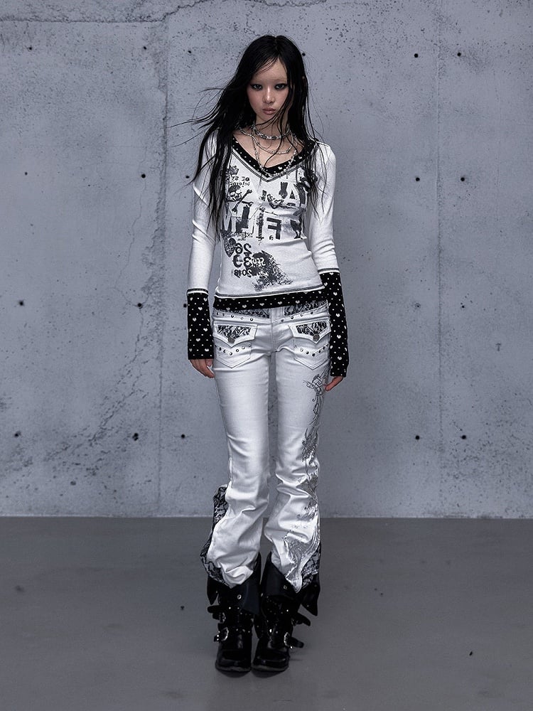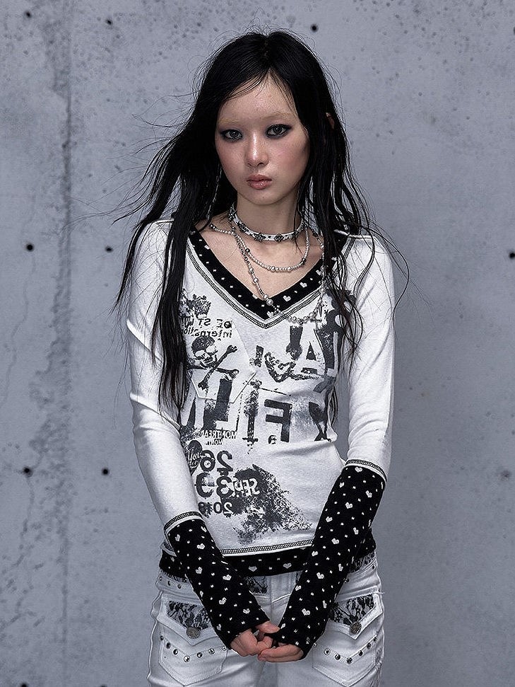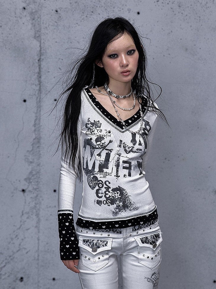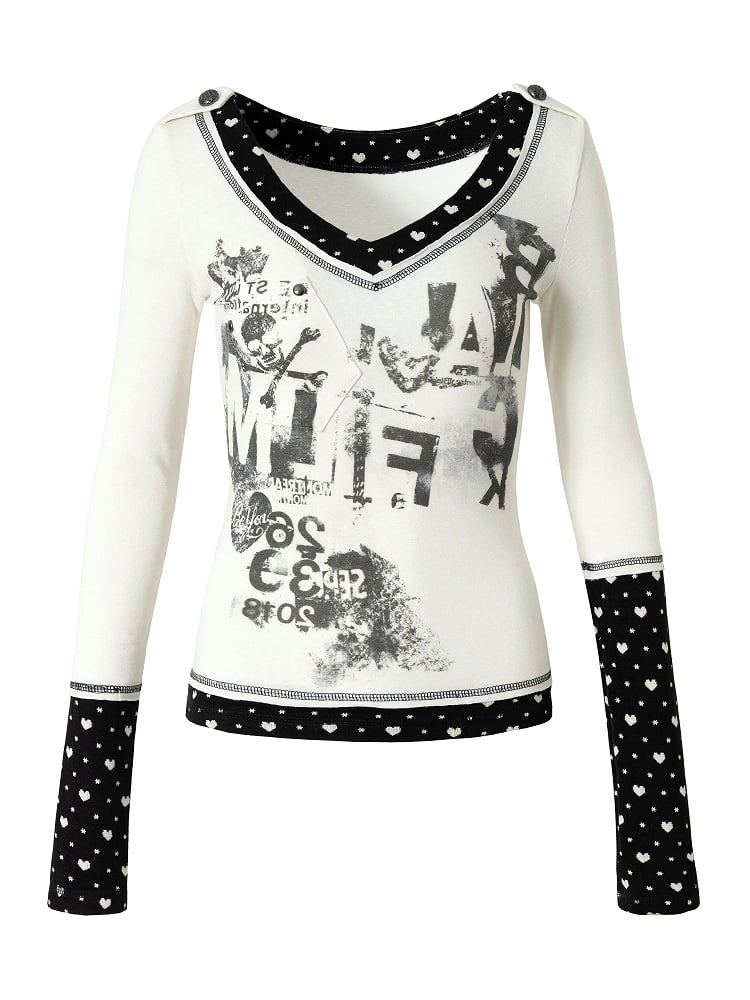 Dive into edgy elegance with our white vintage punk rock long sleeve top. Featuring a daring V-neckline and intricate patchwork craftsmanship, this top is adorned with bold studs and with letter, number, and skeleton prints that scream rebellion. The shoulder is accented with decorative buttons for an added touch of flair, while a single diagonal patch pocket on the chest provides both style and practicality.This charming top features delightful heart patterns adorning the neckline, cuffs, and hem, adding a whimsical touch to its design.