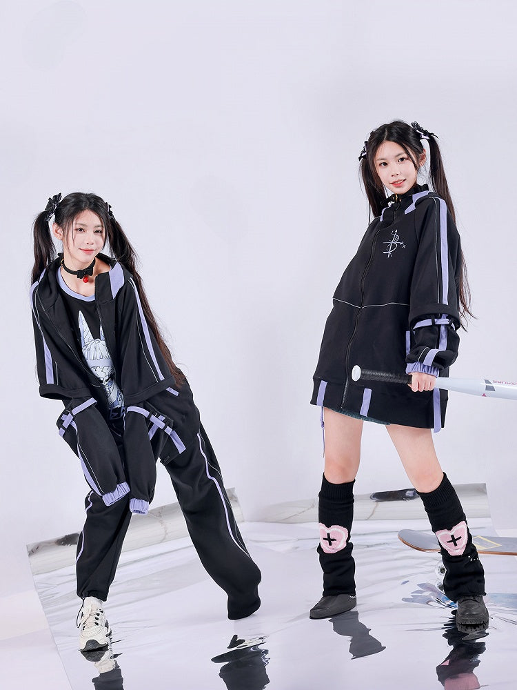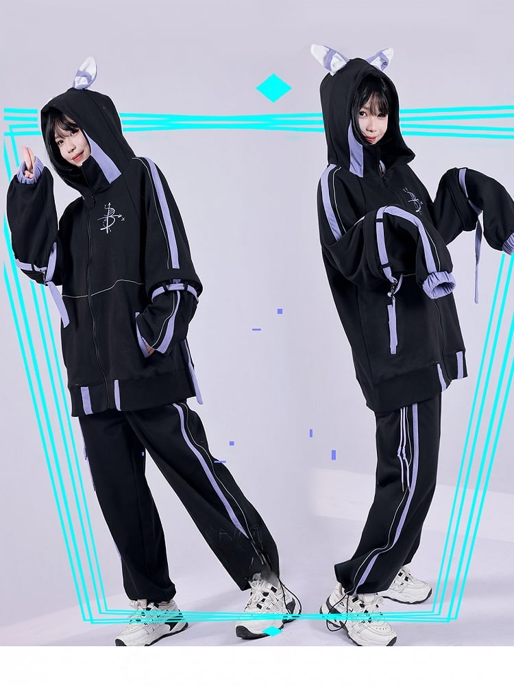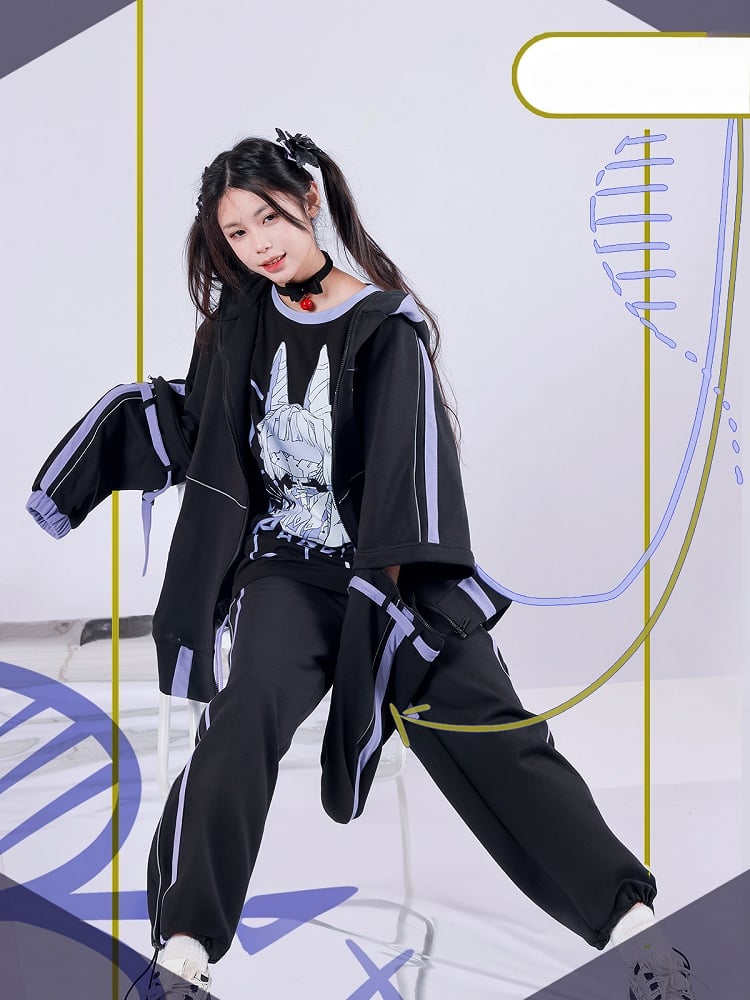 This hooded jacket features a zip-up closure and an adorable design with animal ears on the hood. The sleeves are detachable, allowing you to convert long sleeves into short sleeves, and they are adorned with buckle strap decorations. There is a printed embellishment on one side of the chest, adding a unique touch. The hem of the jacket has an elastic design for a comfortable and adjustable fit.