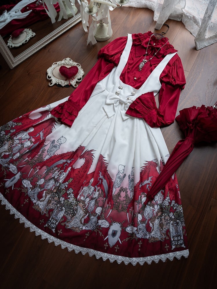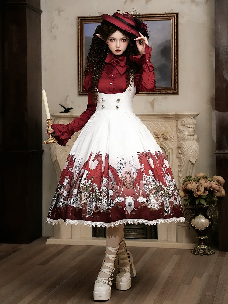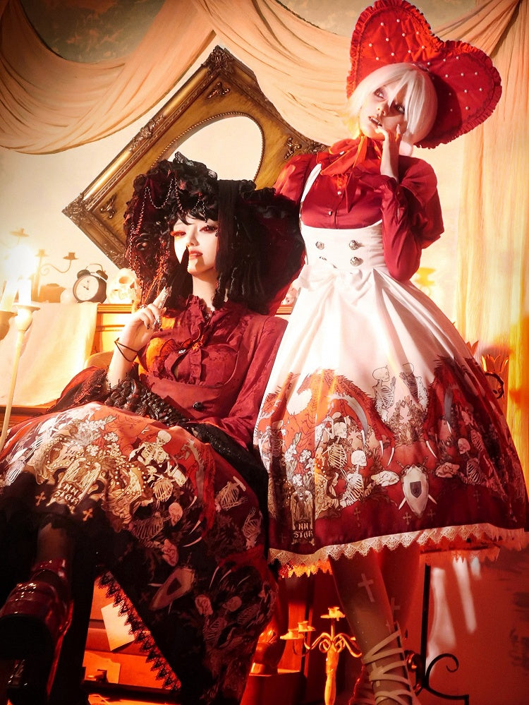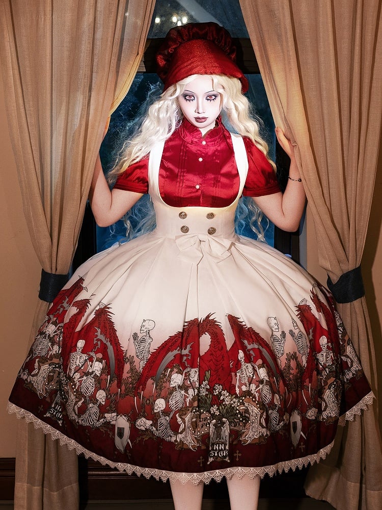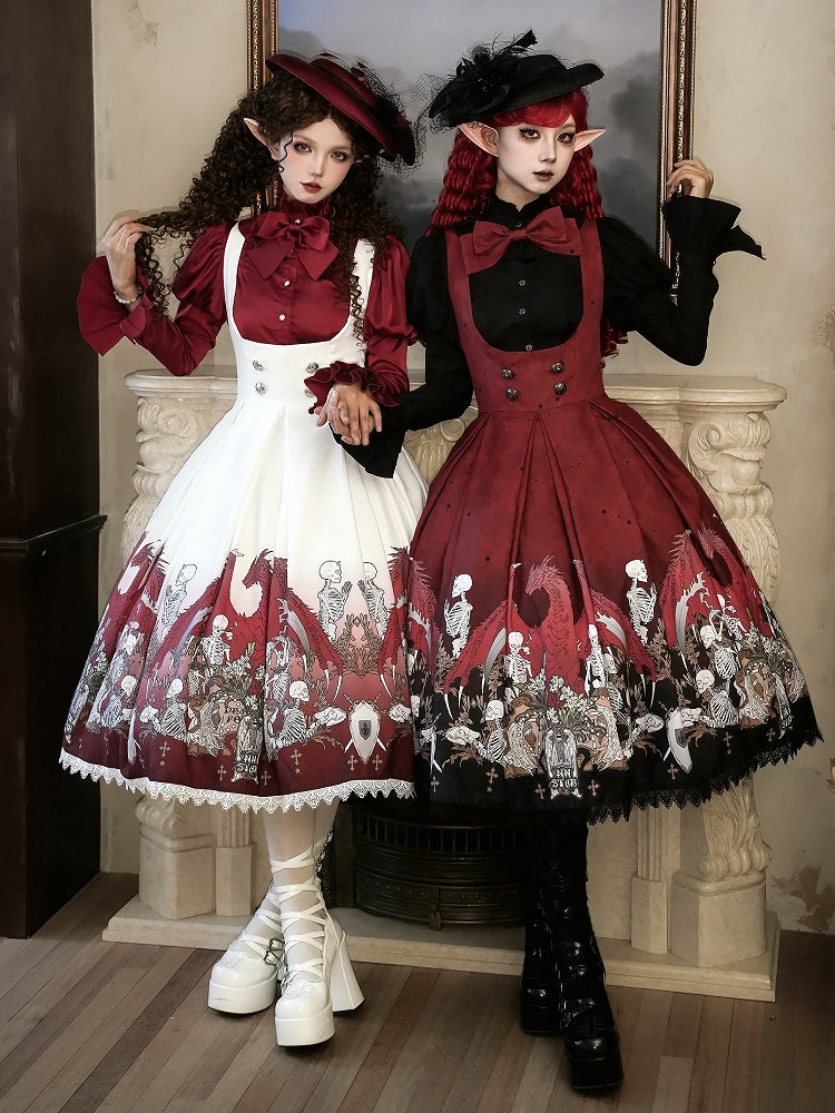 Unleash your dark elegance with this Gothic Lolita dress, featuring skeleton and cross print that adds a touch of edgy sophistication. The dress is beautifully accented with delicate lace trim, enhancing its intricate design. A charming bow at the waist completes the look, cinching the silhouette for a flattering fit. Perfect for those who embrace a unique blend of gothic style and Lolita charm.