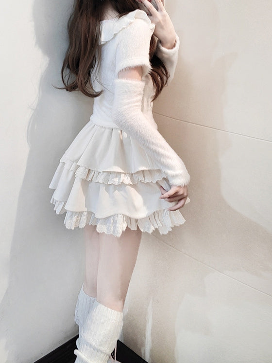 Indulge in a fairytale fantasy with this enchanting sweet ensemble. The delicate white top exudes elegance and charm, perfectly paired with a whimsical tiered skirt reminiscent of a delectable layered cake. A soft pink bow adds a touch of playful femininity, completing a look that's both dreamy and delightful. Ideal for those who adore the kawaii aesthetic, this outfit is perfect for tea parties, special occasions, or simply embracing your inner princess.