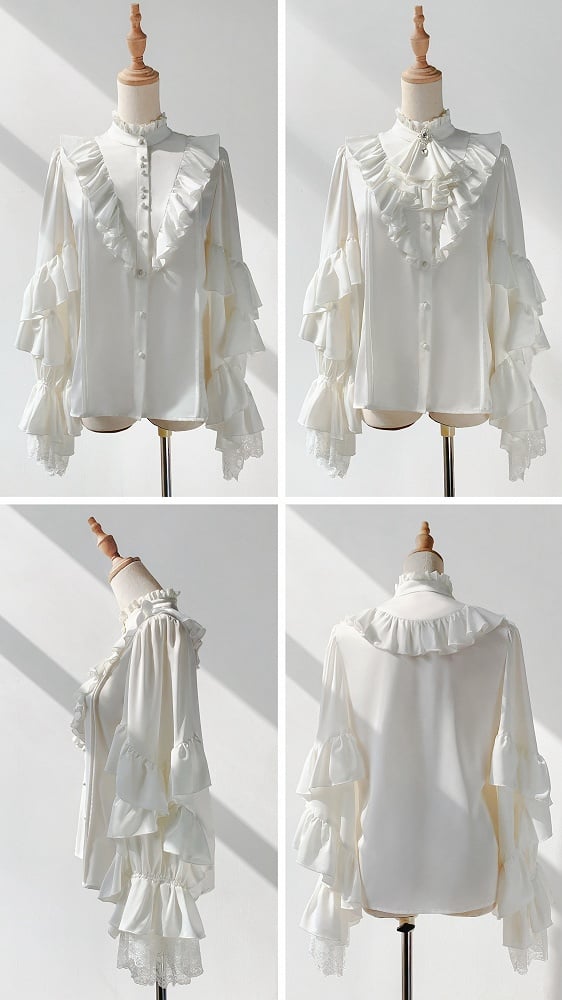 This captivating piece is designed for those who appreciate a touch of gothic elegance in their wardrobe, the rich white hue sets a elegant tone, while the ruffle neckline and covered button placket add a sophisticated flair. Delicate flounce adorn the chest and sleeves, creating a harmonious blend of texture and style that is quintessential to Lolita fashion.