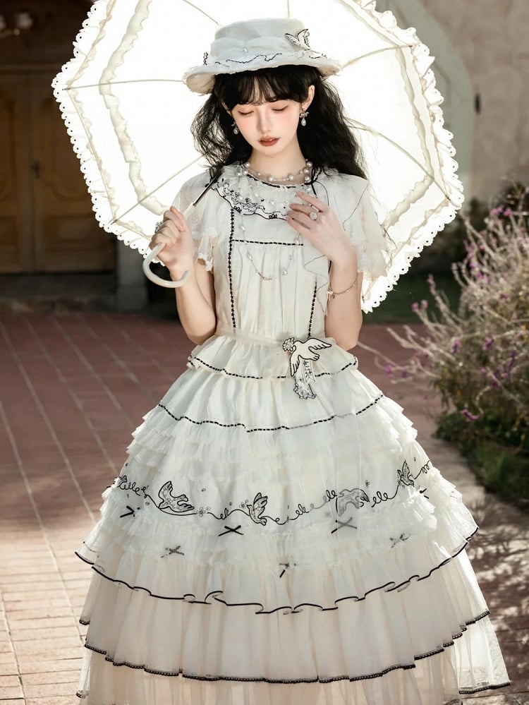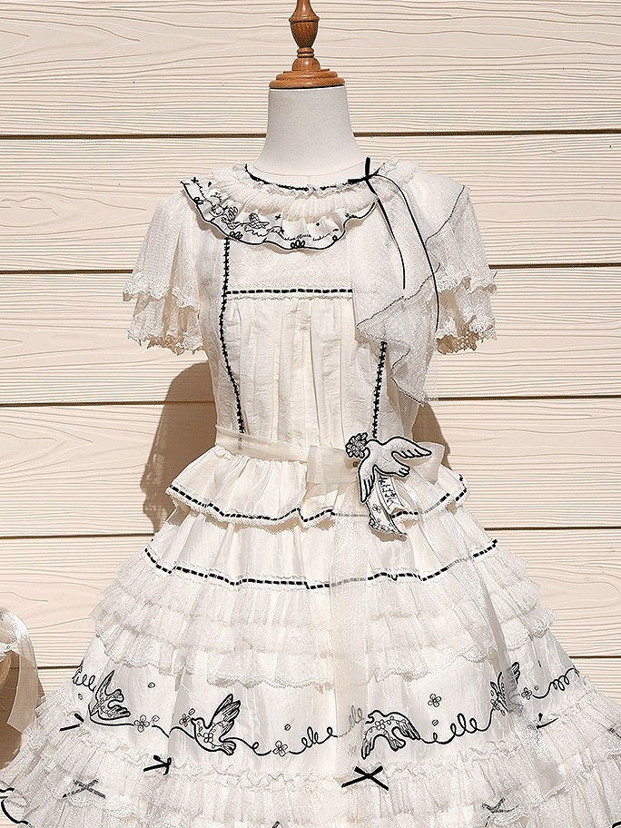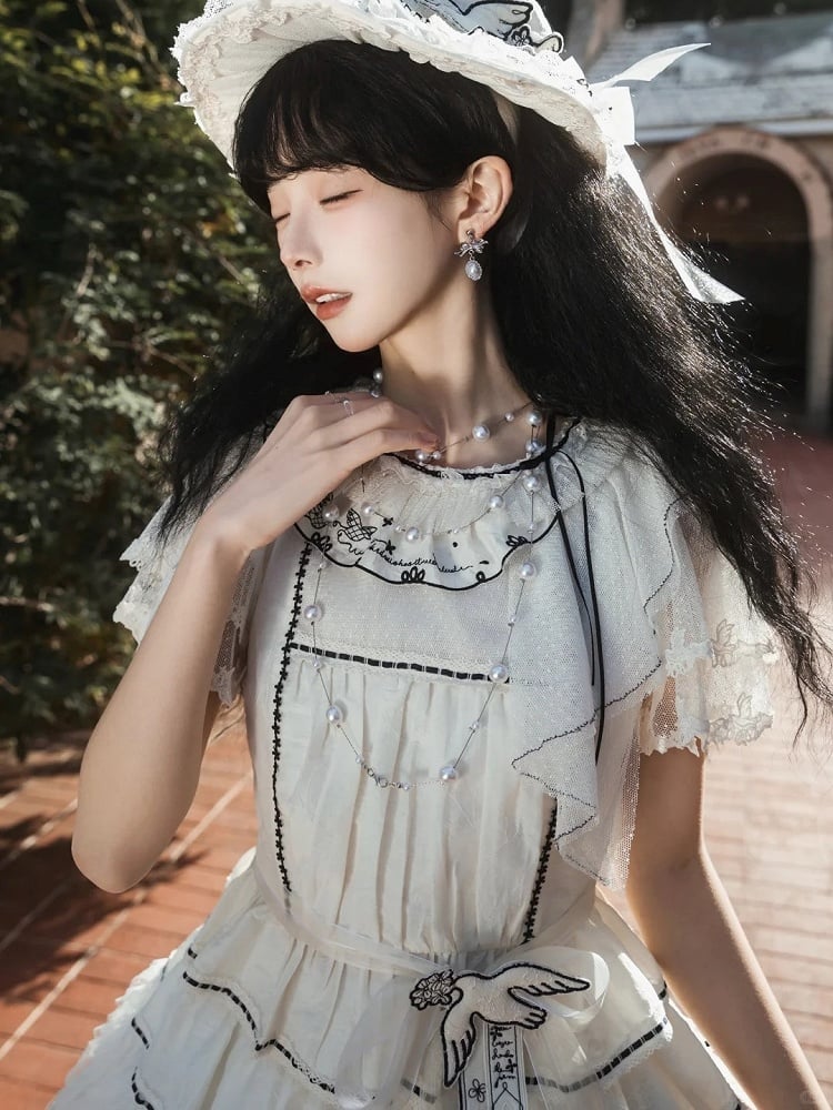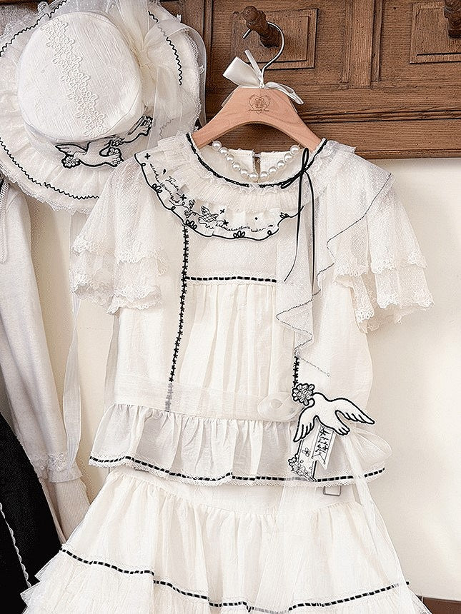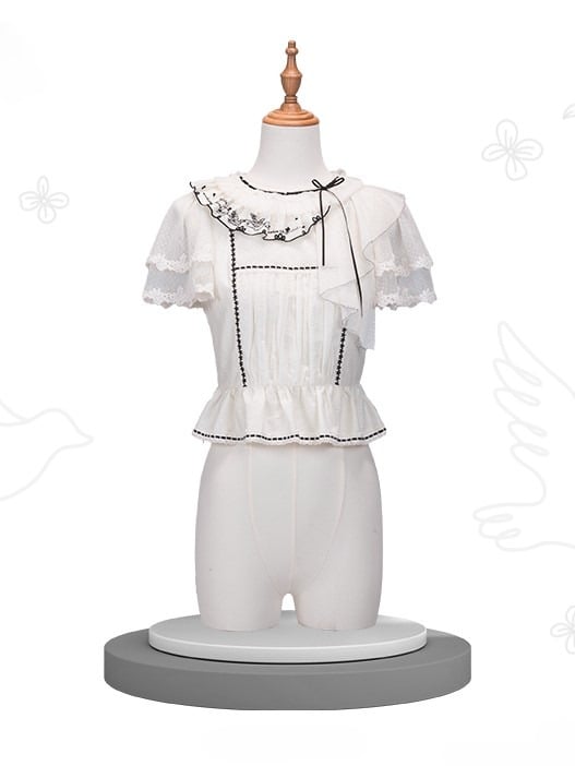 Elevate your Lolita wardrobe with this exquisite white blouse, featuring delicate ruffled lace for a touch of elegance. The contrasting black trim adds a sophisticated edge, making it a versatile piece for both classic Lolita styles. Perfect for pairing with skirts, this blouse is a must-have for those looking to embrace the charm and grace of Lolita fashion.