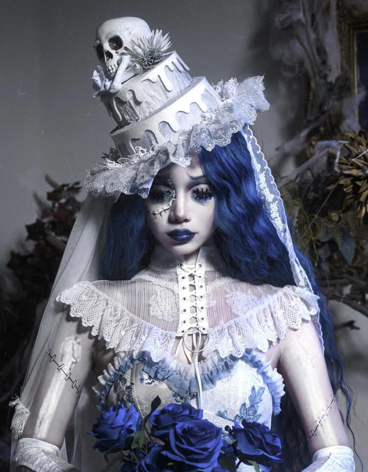 This exquisite garment features delicate lace detailing at the shoulders, the back is adorned with a unique spine-inspired lace-up design. The cape culminates in a voluminous, eye-catching bow at the tail, complemented by multiple layers of trailing fabric for a dramatic and whimsical finish.