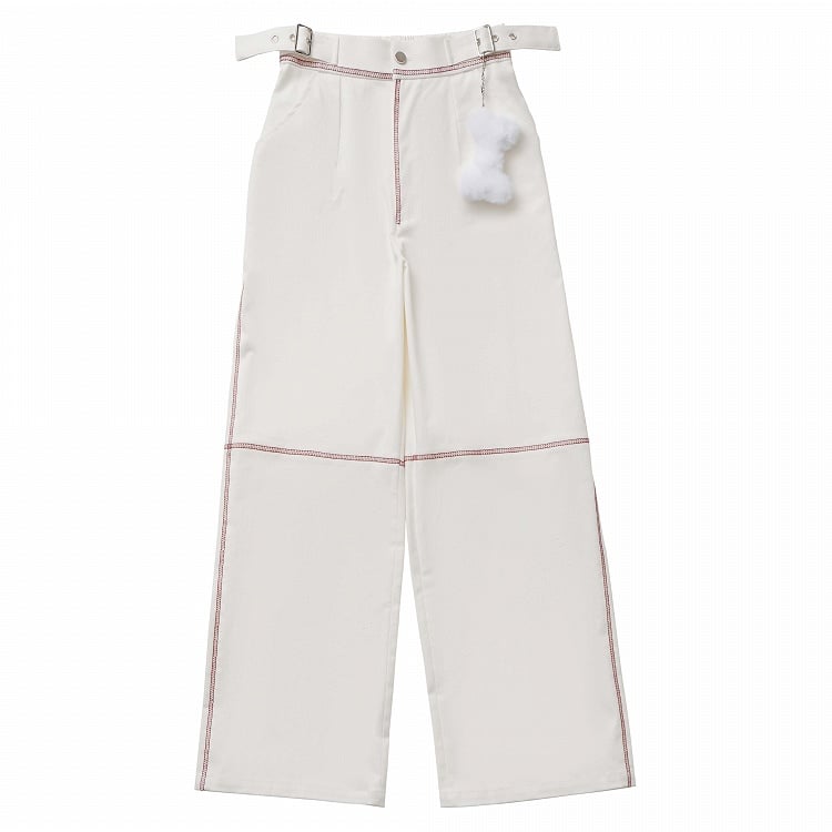 White long pants with red stitching, featuring a front zipper and button closure, and an adjustable elastic waistband at the back. Adorned with a fluffy bone charm at the waist.
