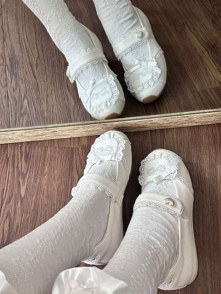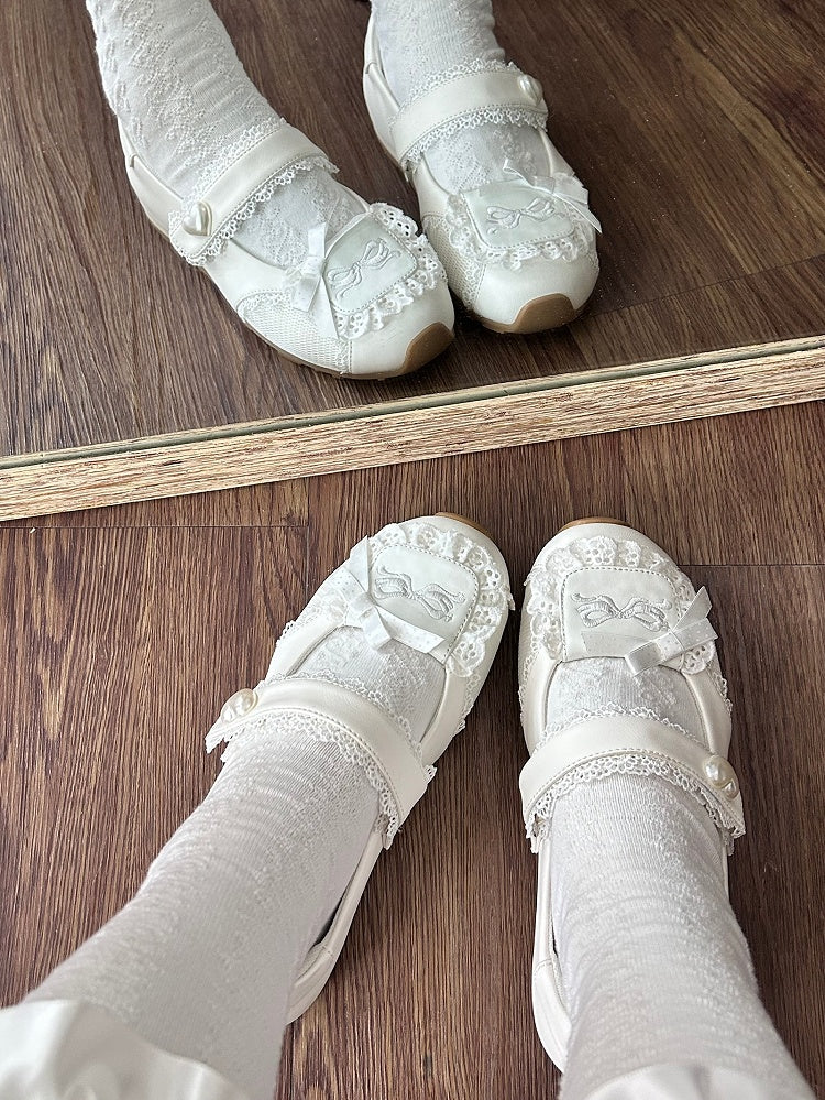 Step into a fairy tale with these white enchanting Lolita flats, designed to capture the essence of sweet elegance. Adorned with delicate lace trim featuring heart embellishments, these shoes are a perfect blend of romance and charm. The convenient hook-and-loop strap ensures a secure fit, while the whimsical bow details add a touch of playful sophistication.