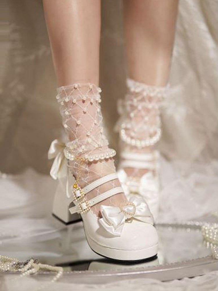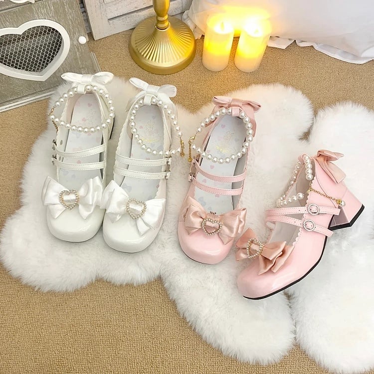 Elevate your style with these charming white Lolita-inspired heels, featuring a chunky high heel for added height and confidence. The shoe is adorned with a beaded heart bow detail on the upper, adding a touch of whimsy and sweetness. Delicate bow accents enhance the aesthetic, while a circular snap closure ensures a secure fit. The detachable beaded chain offers versatility, allowing you to customize your look with ease.