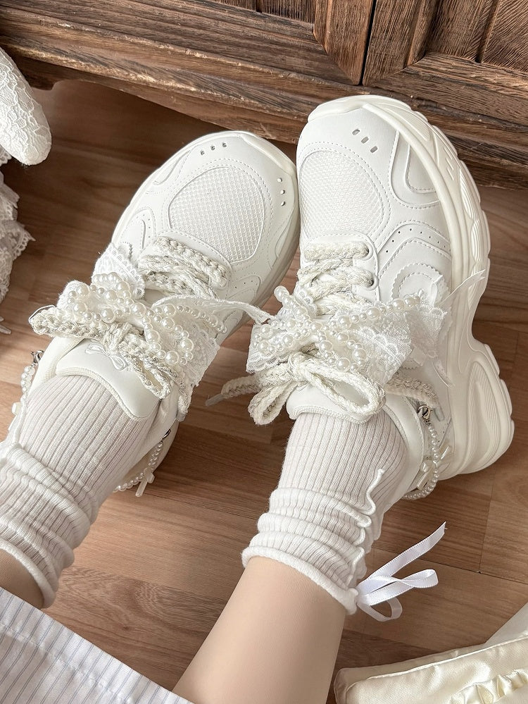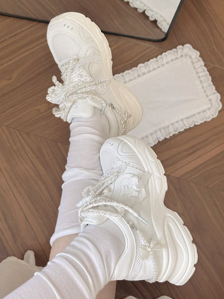 Step into a world of whimsical charm with these white Sweet Lolita platform sneakers. Designed for those who adore a fusion of playful elegance and comfort, these sneakers feature delightful bow details and a versatile removable beaded chain, allowing you to customize your look to match your mood. The lace-up design ensures a secure fit while the thick platform sole offers added height and a trendy edge.