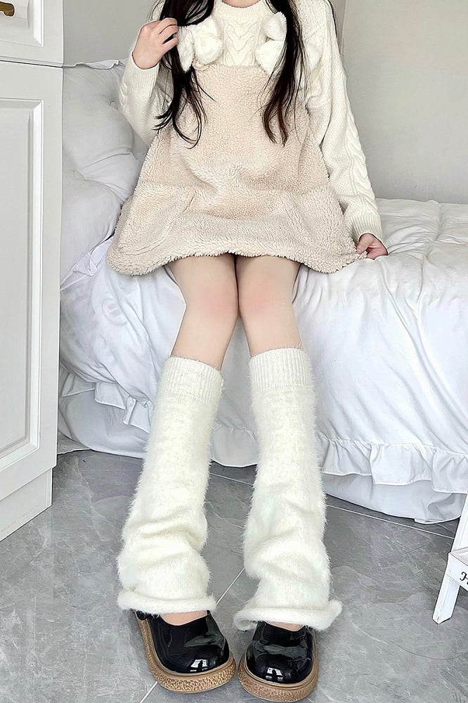 These white thickened plush flared knitted leg warmers are made of plush knitted fabric, featuring a flared design to enhance styling. Suitable for daily cute styles and gentle looks, combining warmth and comfort.