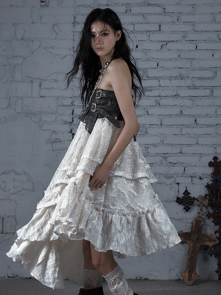 A Fusion of Vintage and Dark Aesthetics. This skirt captures the essence of a courtly knight with its streetstyle nonchalance. Featuring intricate craftsmanship and an artful distressed aesthetic, the design plays with asymmetrical waistlines, romantic lace, and dark plaid to evoke a dynamic contrast of strength and romance. Experience the dual wearability as both a bustier dress and a skirt, catering to a girl's punk fantasy.