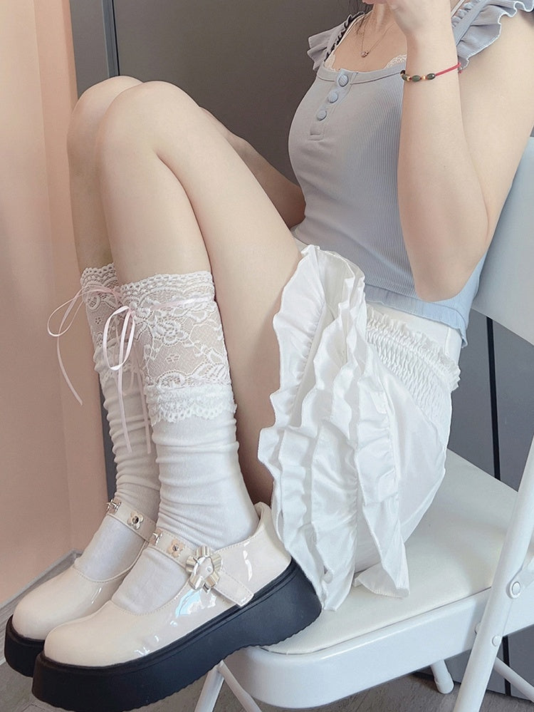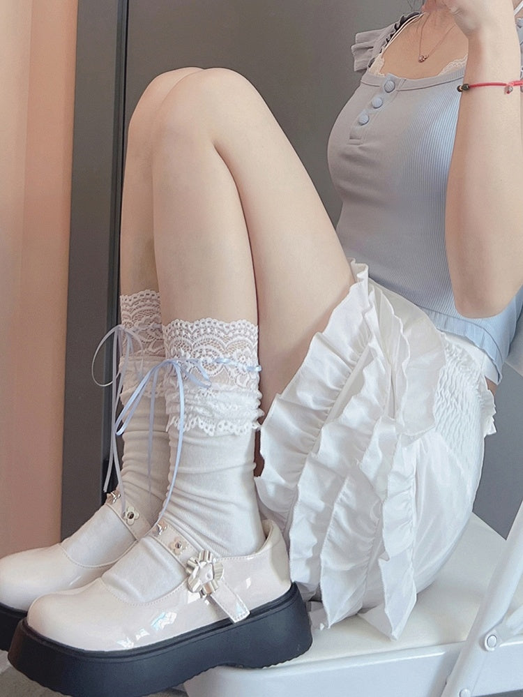 Elevate your wardrobe with these charming socks, designed with a delicate lace-trimmed cuff and adorned with dainty ribbon bows. The minimalist yet sophisticated style ensures versatility, making them a perfect match for any ensemble, whether you're aiming for a cute kawaii look or a classic lolita outfit.