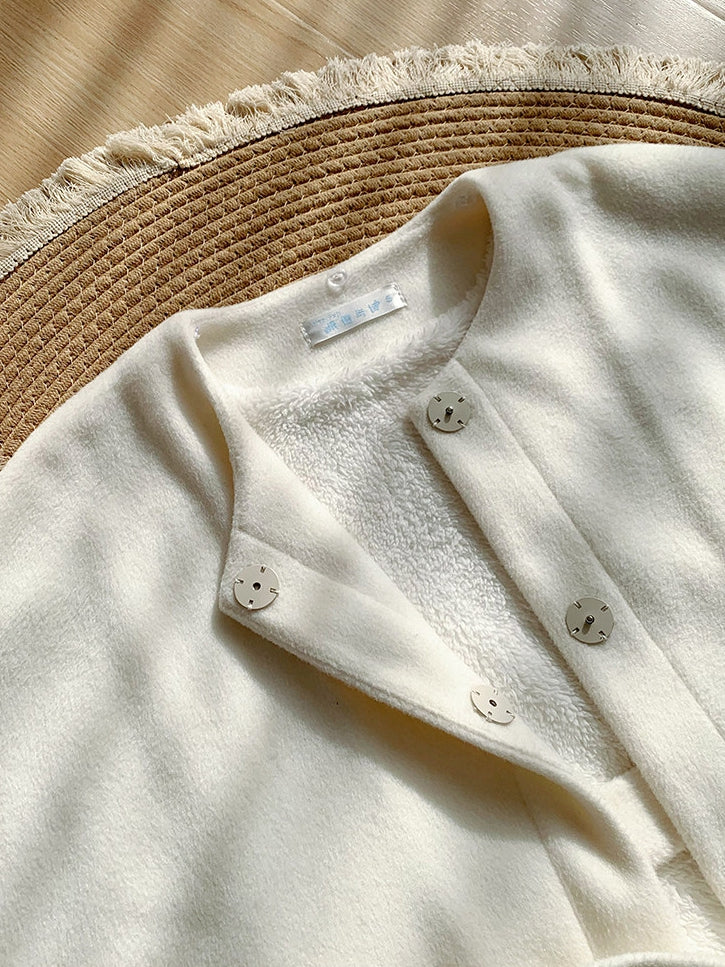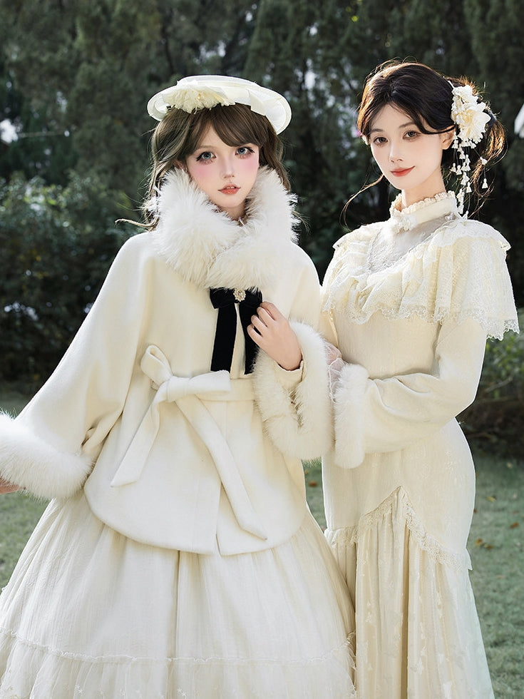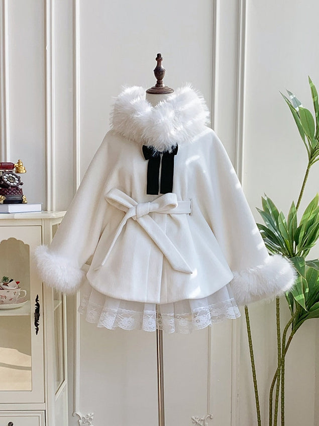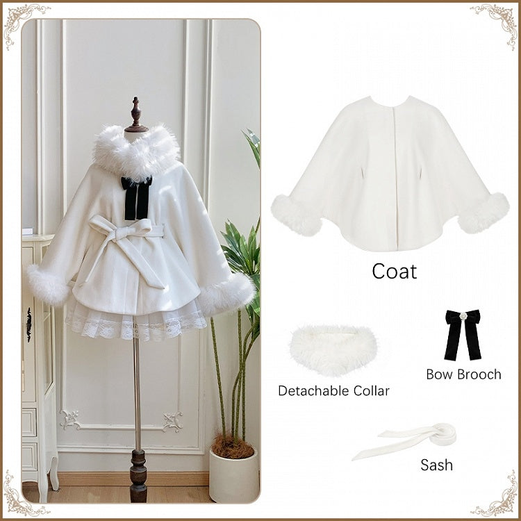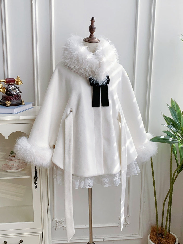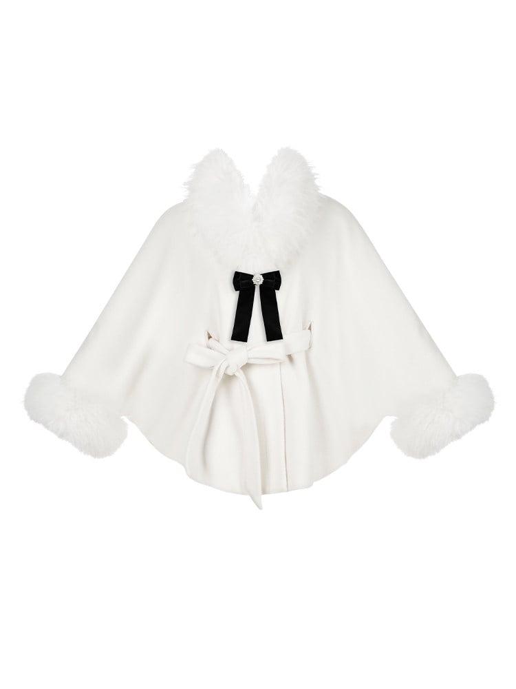 This elegant cape coat is designed for both style and practicality, featuring a detachable fur collar that can be easily removed for a versatile look. It also includes a detachable black bow accessory, allowing for customizable styling. The coat closes with concealed snap buttons along the placket, ensuring a seamless and sleek appearance.