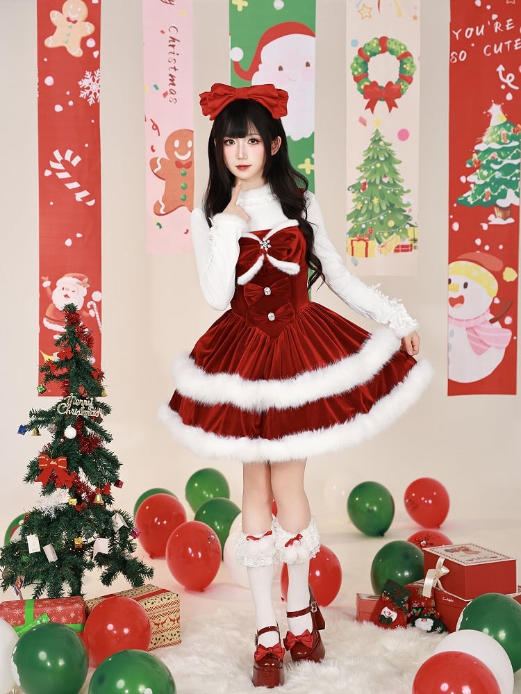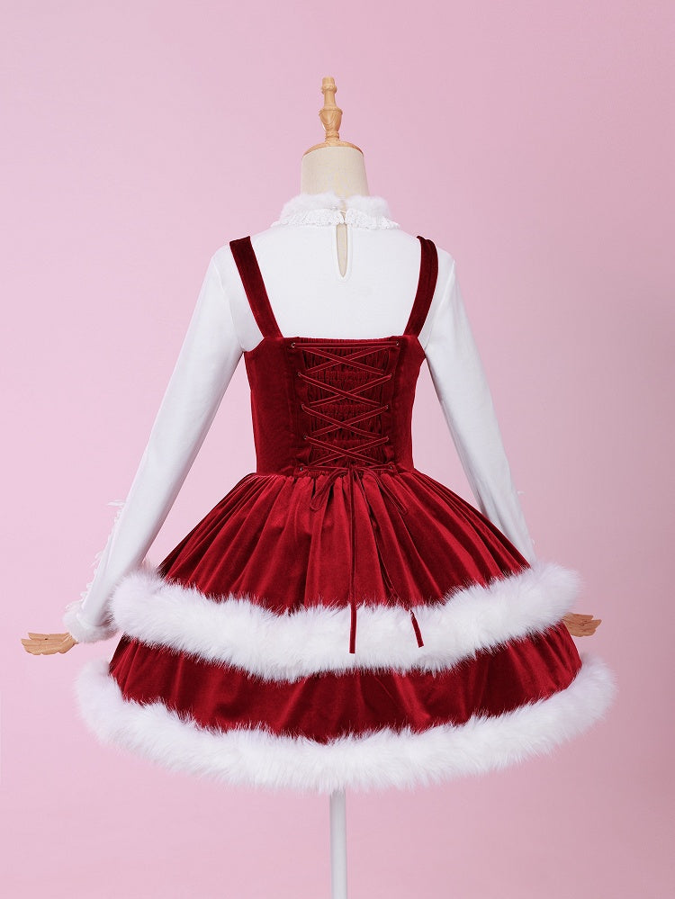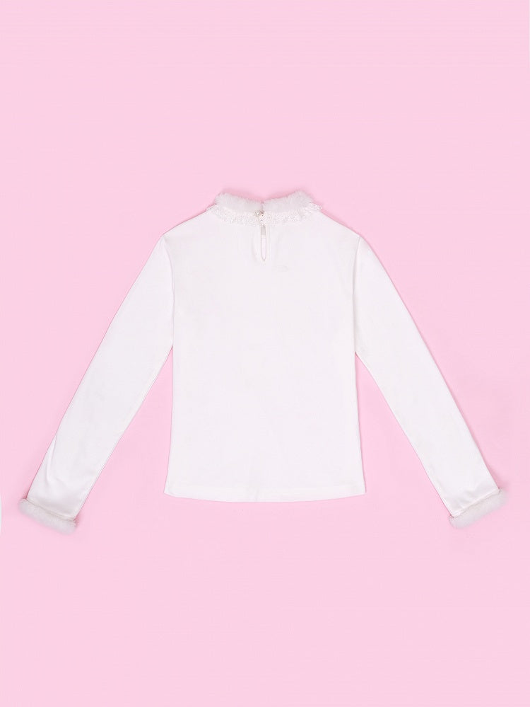Crafted from soft fabric, this white long-sleeve top features a plush fur collar and cuffs that add a touch of opulence and warmth, the sleeves are adorned with delicate ruffles and charming bow accents, creating a subtle yet eye-catching accent that enhances the overall design.
