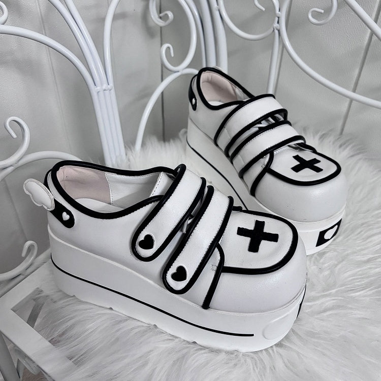 Step into a world where sweetness meets edge with our Gothic Sweetheart Platform Shoes. These striking shoes feature a bold platform sole that adds height and drama to any outfit. The design is accentuated with a delicate cross charm, offering a touch of mysterious allure that complements the sweet-yet-cool aesthetic. Crafted for those who dare to stand out, these shoes blend comfort with a rebellious spirit, making them perfect for both lolita and kawaii fashion enthusiasts. Ideal for expressing your unique style, whether you're heading to a chic gathering or a casual day out. Elevate your wardrobe with these statement-making shoes that embody the essence of sweet coolness.