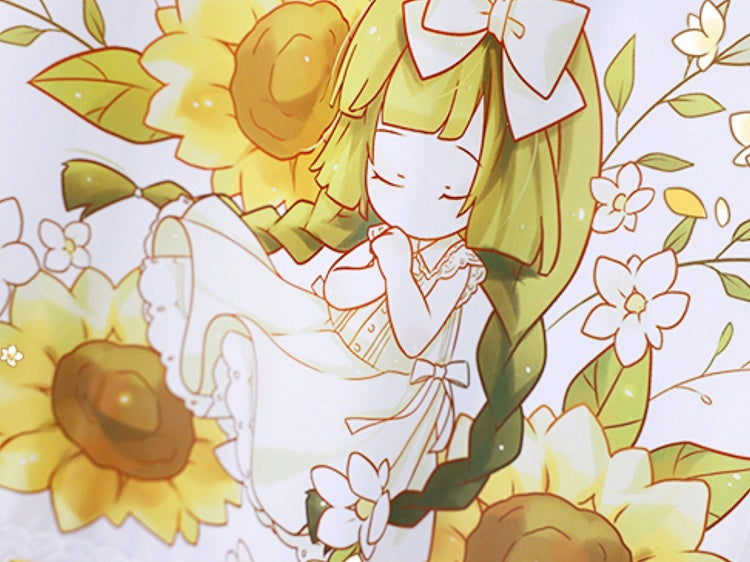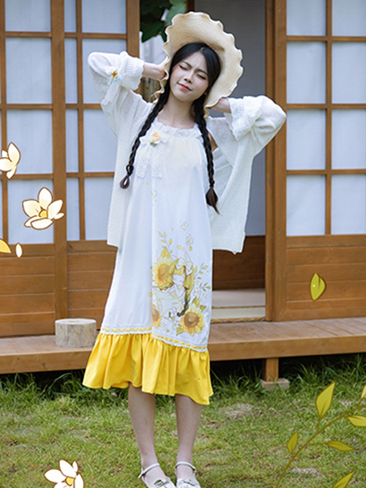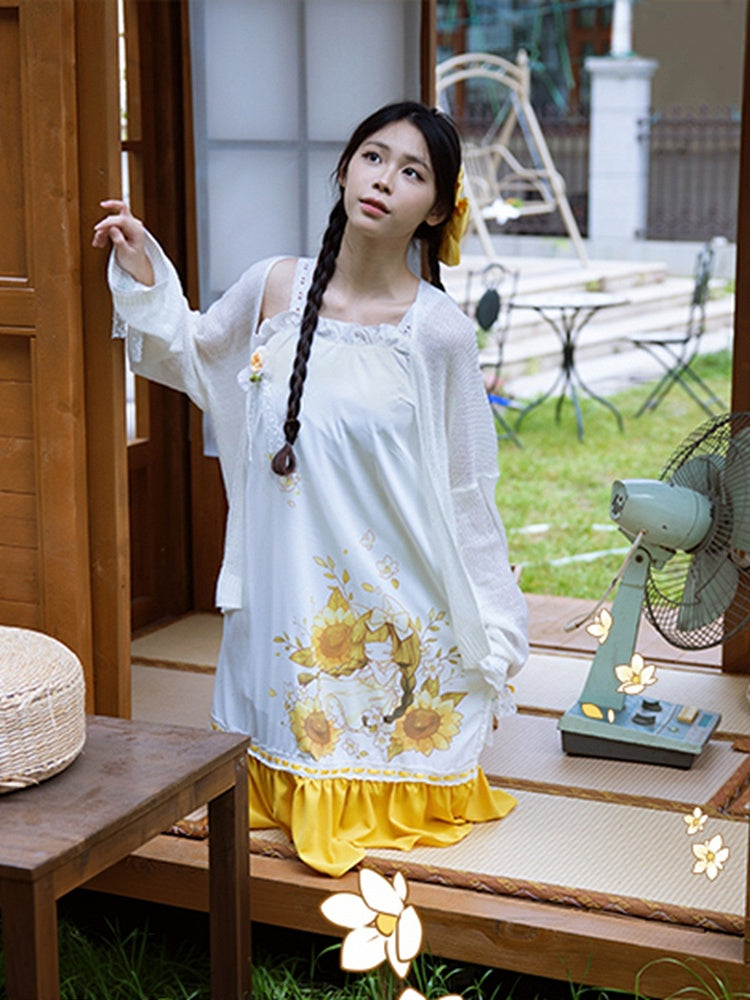 This charming cami dress features wide, lace-trimmed shoulder straps and a ruffled lace neckline for a delicate touch. The chest is adorned with a knitted sunflower lace bow, adding a lovely detail. The dress showcases a delightful print of girls and sunflowers, bringing a whimsical feel. The hem is color-blocked and decorated with lace trim and inset ribbons, enhancing the overall design.