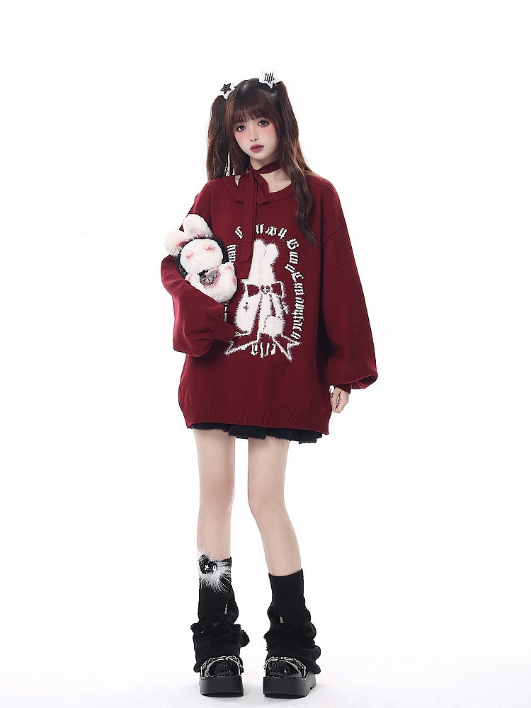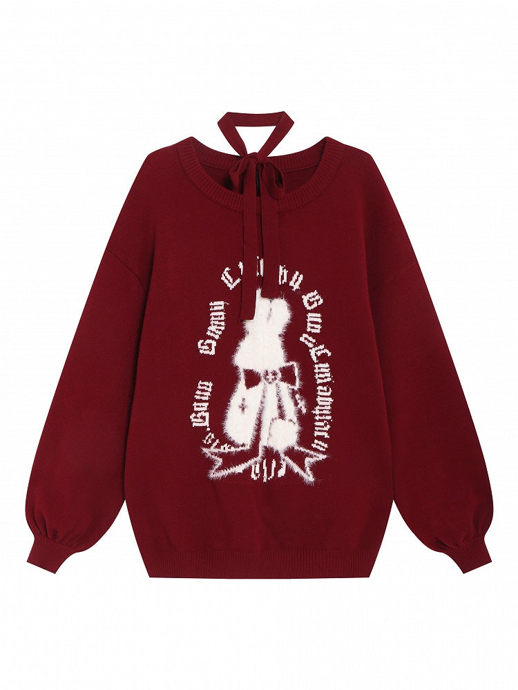Cozy up in this chic wine red sweater featuring a classic crew neckline and playful bishop sleeves. This mid-length, long-sleeve design offers a relaxed fit with a touch of stretch, crafted from thick rabbit hair core-spun yarn for ultimate comfort. The front showcases an adorable white rabbit adorned with a bow, surrounded by charming white script, adding a whimsical touch to your wardrobe. Perfect for a stylish and comfortable look.