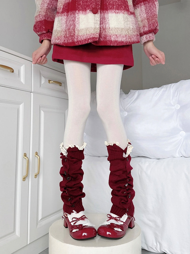 The wine red base is retro and elegant, button design and ruffle elements add exquisite details, the knitted fabric is skin-friendly and warm, fits legs snugly without bulkiness, suitable for retro style, sweet and cool style and daily casual wear.