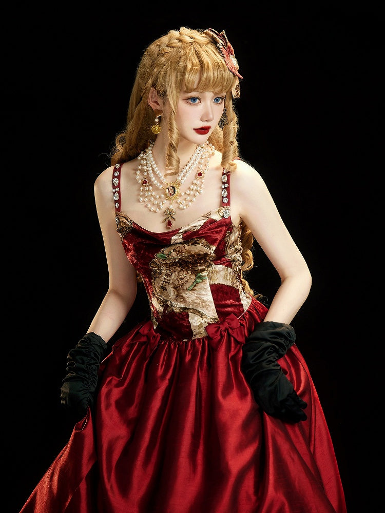 This sophisticated piece features a graceful cowl neckline, adding a touch of vintage allure. The shoulder straps are adorned with sparkling rhinestones, offering a hint of glamour that catches the light beautifully. A delicate bow accentuates the waist, completing the look with a charming finish. Ideal for special occasions or adding elegance touch to your everyday wardrobe, this dress embodies the essence of Lolita fashion with a modern twist.