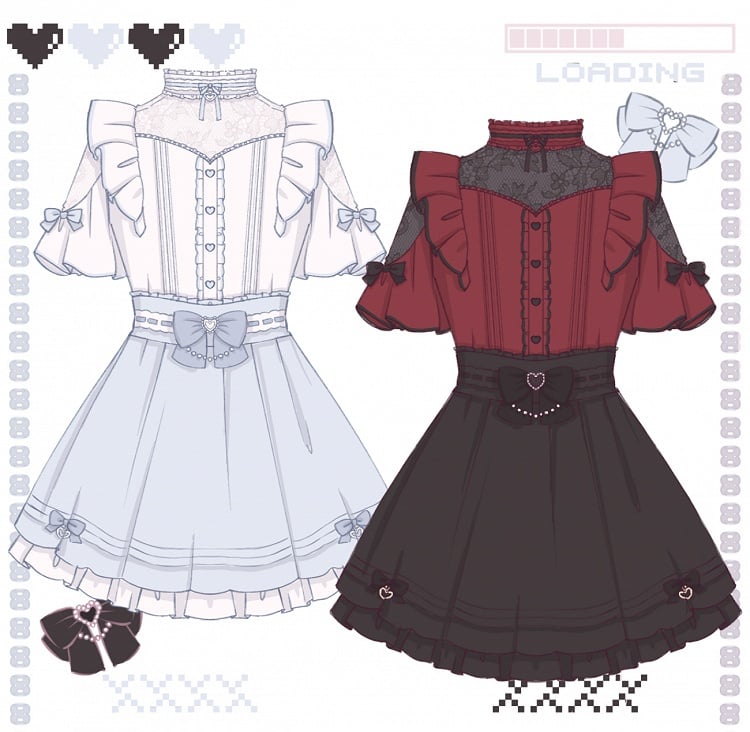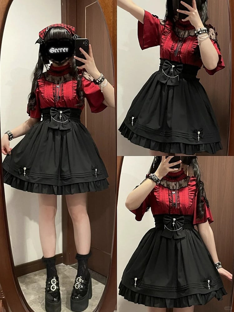 This top features a ruffle neckline design with a bow decoration at the neckline and lace detailing on the chest. Ruffle trim decorates the shoulders, and the front of the garment is adorned with accordion pleats and heart-shaped button decorations. The skirt is designed with a high waist and features a butterfly charm with a cross attached to the waist and hem.