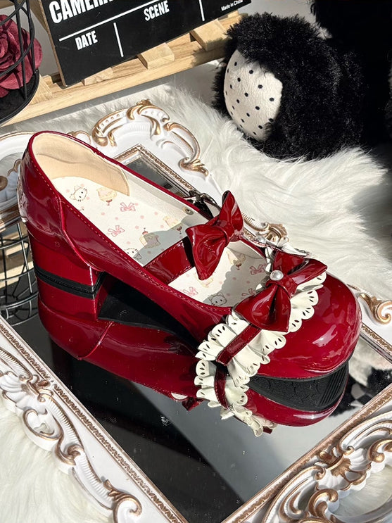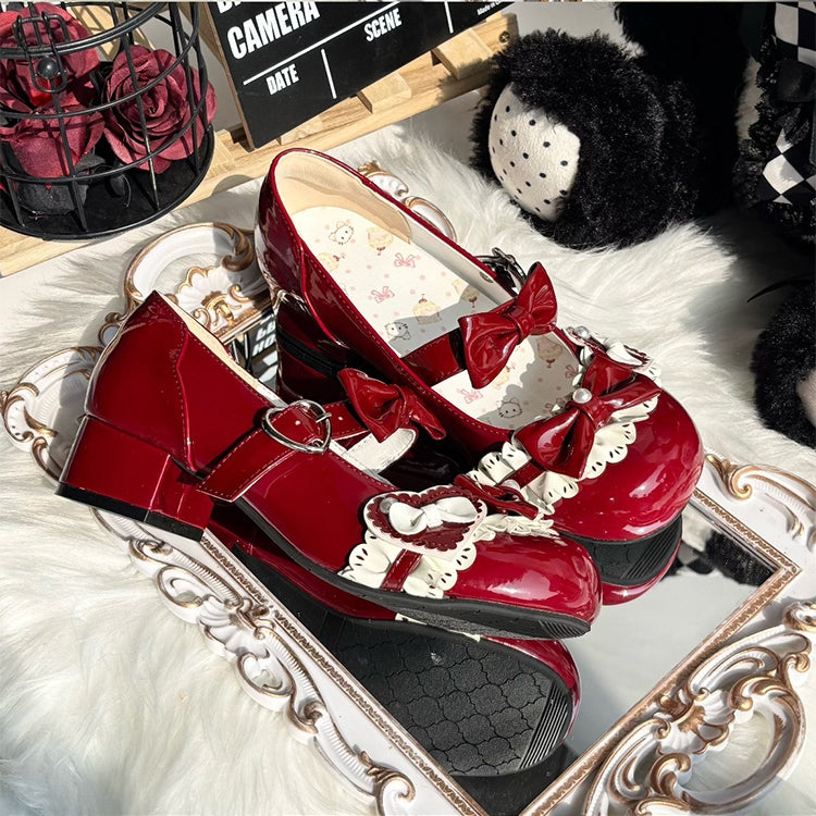 Step into a world of whimsy and charm with these wine red Sweet Lolita Mary Jane shoes. Crafted for the ultimate Lolita fashion enthusiast, these shoes feature a delightful round-toe design and comfortable low heel, perfect for all-day wear. Adorned with intricate beadwork, a charming heart detail, and playful bow accents, these Mary Janes effortlessly capture the essence of sweet, girlish elegance.
