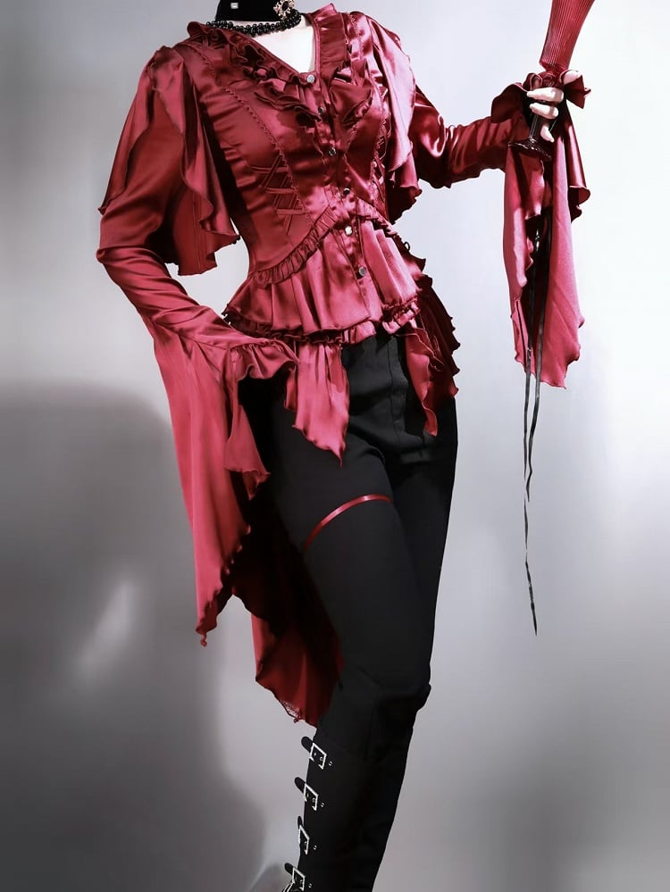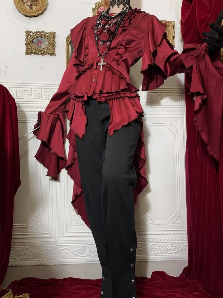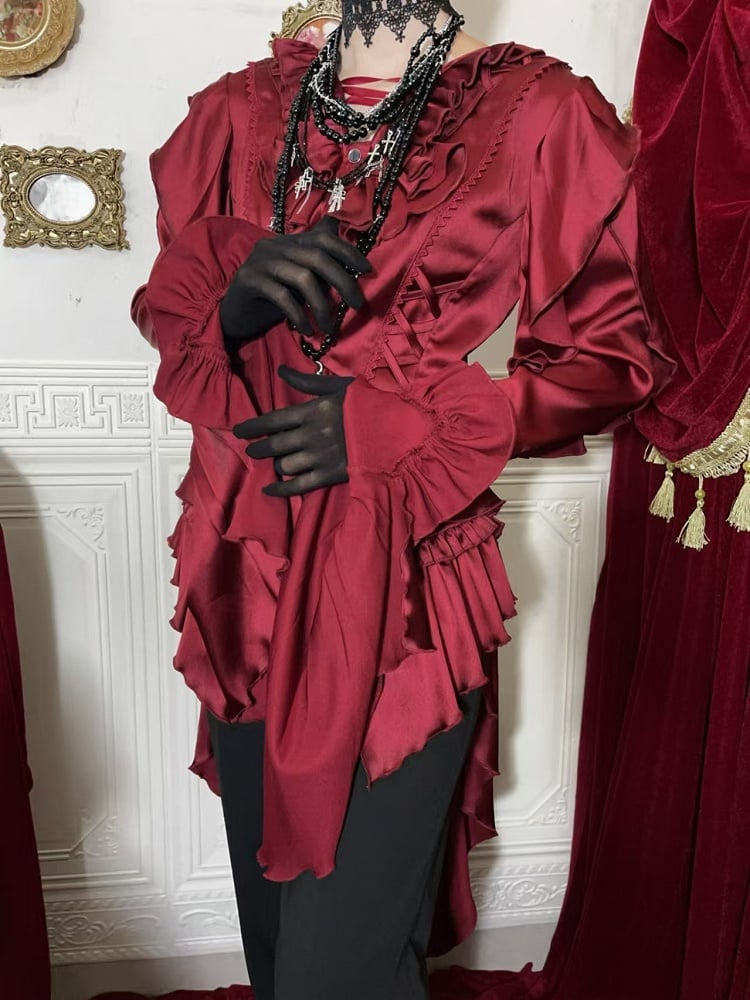 Crafted from luxurious satin, this shirt features a sophisticated V-neckline accentuated by a delicate lace-up, allowing you to customize the fit to perfection. The neckline is adorned with intricate flounce detailing, and the cascading ruffle cuffs bring an element of drama and flair. The back lace-up ensures a tailored fit, enhancing the shirt's regal silhouette.
