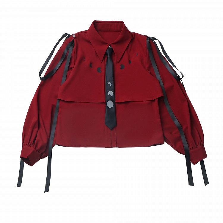 Elevate your style with this captivating faux two-piece shirt, a delightful blend of elegance and whimsy. This unique design features a charming moon pattern, adding a celestial touch to your wardrobe. The shirt is adorned with a delicate ribbon, perfectly complementing the included tie for a sophisticated yet playful look.