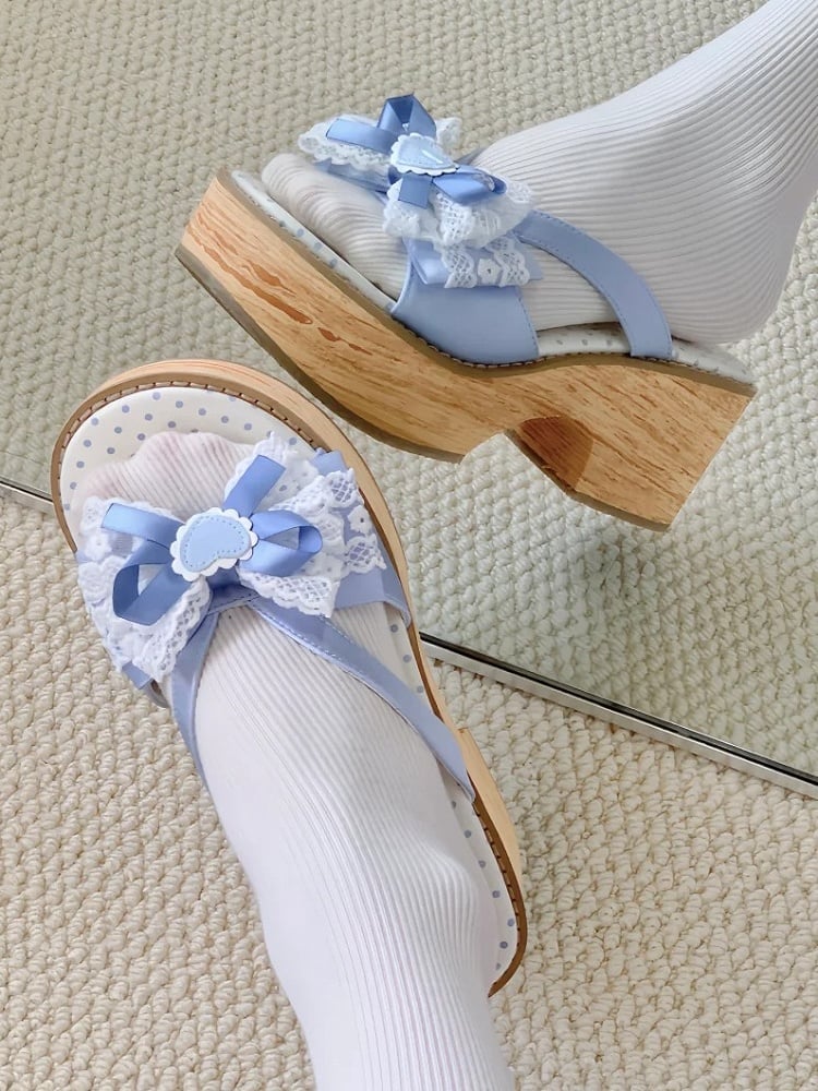 Step into the enchanting world of Wa Lolita with these exquisite platform sandals. Designed to blend traditional Japanese aesthetics with the charming elegance of Lolita fashion, these sandals are a true statement piece. The wood grain sole adds a touch of nature-inspired sophistication, while the heart patch detail brings a playful and romantic flair. The lace-trimmed bow on the upper adds an extra layer of delicate femininity.