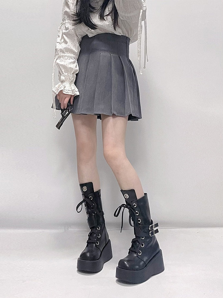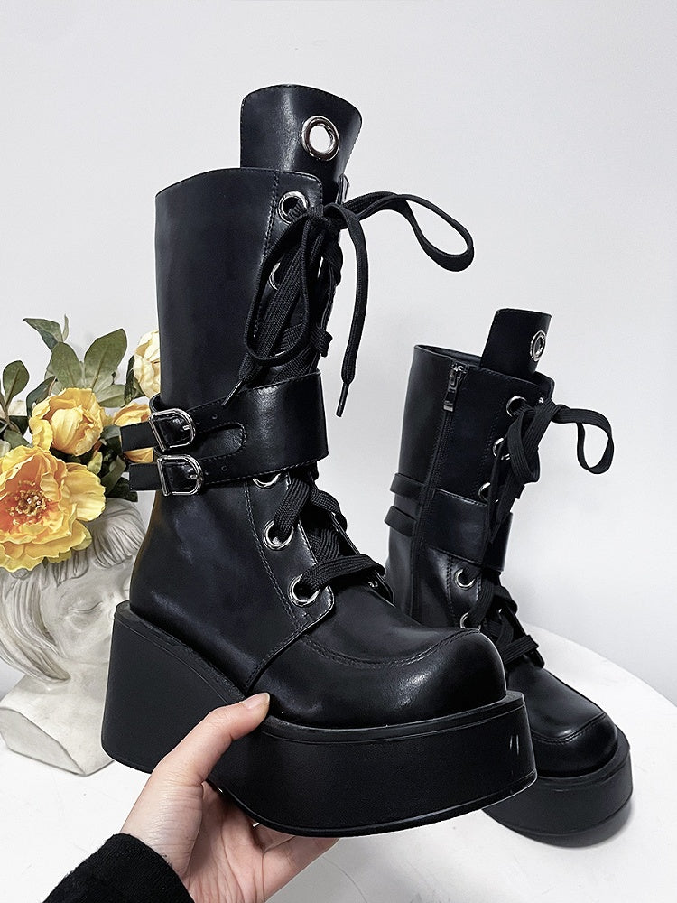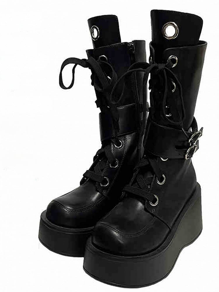 Step into a world of edgy elegance with these platform lace-up knee-high boots. Featuring a bold thick sole, these boots offer both height and style, perfect for making a statement. The intricate lace-up design adds a touch of sophistication, while the adjustable buckle straps ensure a snug and personalized fit.Ideal for those who love to blend alternative fashion with a touch of chic.