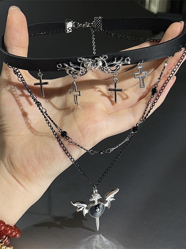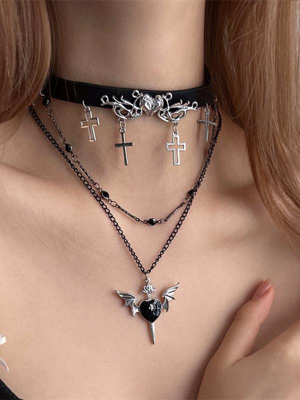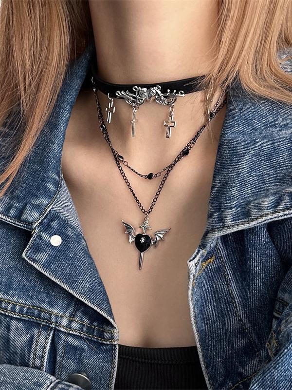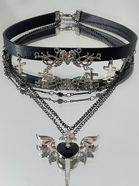 This necklace features a black leather choker adorned with multiple black chains, elegantly embellished with a black heart that showcases silver wing accents.