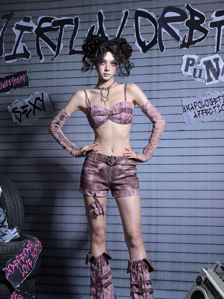 Pink Sequin Cami Top with Rhinestone Butterfly Accent: This eye-catching cami features delicate spaghetti straps and a structured bikini-style bust with built-in padding. Adorned with shimmering sequins, the top boasts a striking PU strap across the chest, highlighted by a central rhinestone-encrusted butterfly. Pink studs embellish each side, while a PU band at the hem is cleverly connected to a detachable ruffled peplum in vintage dusty pink double-tiered tulle, enhanced with a subtle silver sparkle for a Y2K-inspired punk look.