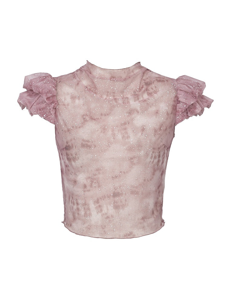 Y2K Vintage Pink Tulle Short Sleeve Top: This soft, distressed retro tee features shimmering silver graphics and playful double-layered puff sleeves. Perfect for the edgy punk girl with a hint of girly charm.