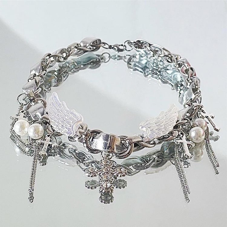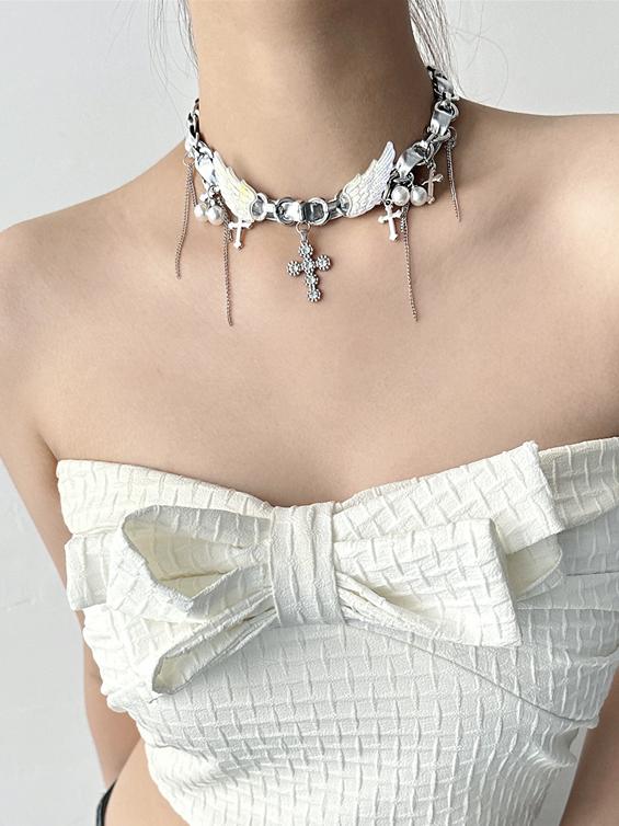 This elegant choker features a striking cross and wing-shaped pendant, exuding a sense of mystique and grace. The chain is adorned with delicate tassels and lustrous pearls, adding a touch of sophistication and charm.