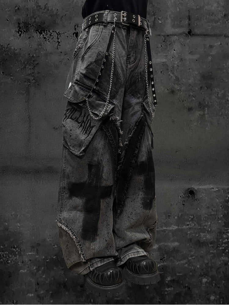 These grey wide-leg jeans combine splatter designs with bold cross details for Y2K-inspired rebellion. The raw hem finish adds contemporary edge to the retro silhouette, creating a balance of comfort and daring style. Perfect for casual or night-out wear, they capture the essence of early-2000s fashion with modern versatility.